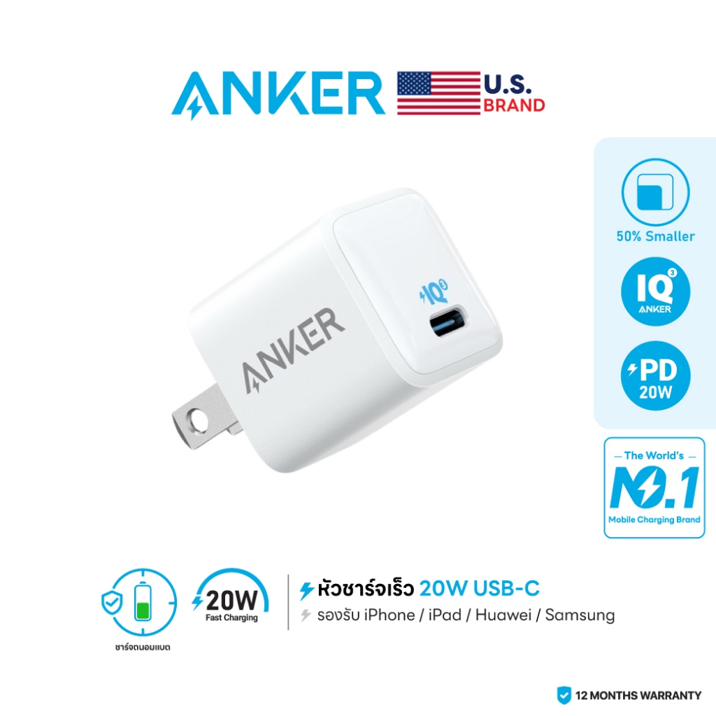 Anker หัวชาร์จถนอมแบต iPhone16 (20W) PowerPort III Nano PIQ3.0 ชาร์จไว 20W รองรับอุปกรณ์ USB-C
