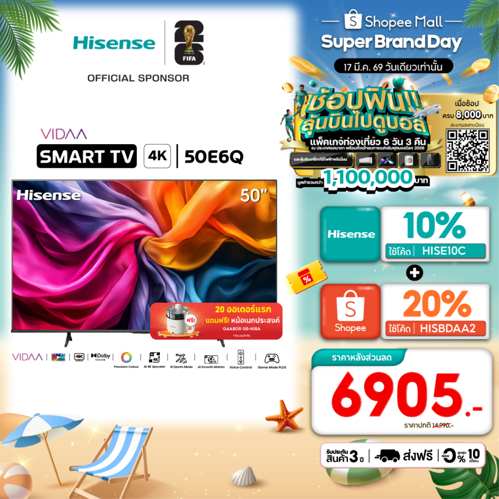 Hisense TV รุ่น 50E6Q 4K Ultra HD Smart TV Voice Control WIFI Build in Netflix