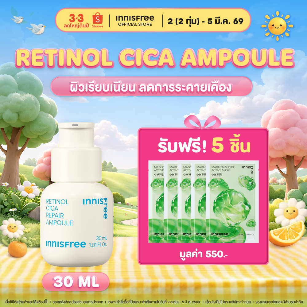 แอมพูลลดสิว innisfree Retinol Cica Ampoule 30ml. ลดรอยแดง สิวผดผื่น ผิวกระชับเรียบเนียน retinol 0.015%