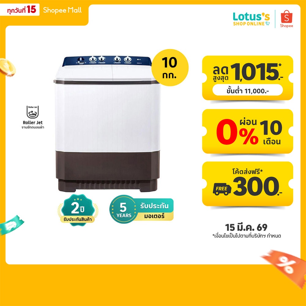 แอลจี เครื่องซักผ้า 2 ถัง 10 กก. รุ่น TT10NARG LG TWIN TUB WASHING MACHINE 10KG TT10NARG WHITE