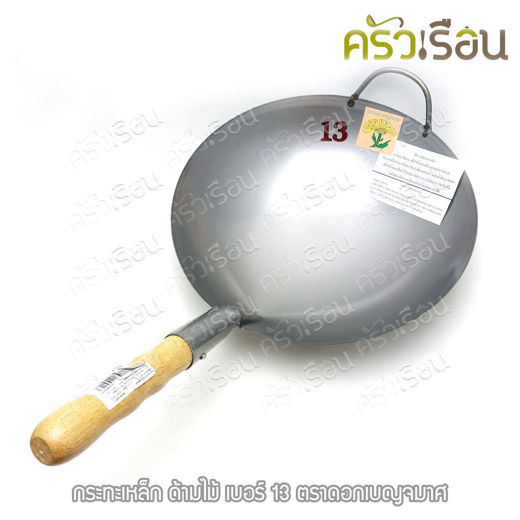 ตราดอกเบญจมาศ กระทะเหล็ก ด้ามไม้ ราคาต่อใบตามขนาด เผาไฟก่อนใช้งาน กระทะ กระทะด้าม กระทะเหล็กด้ามไม้