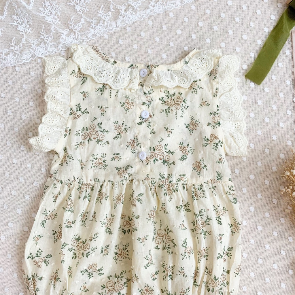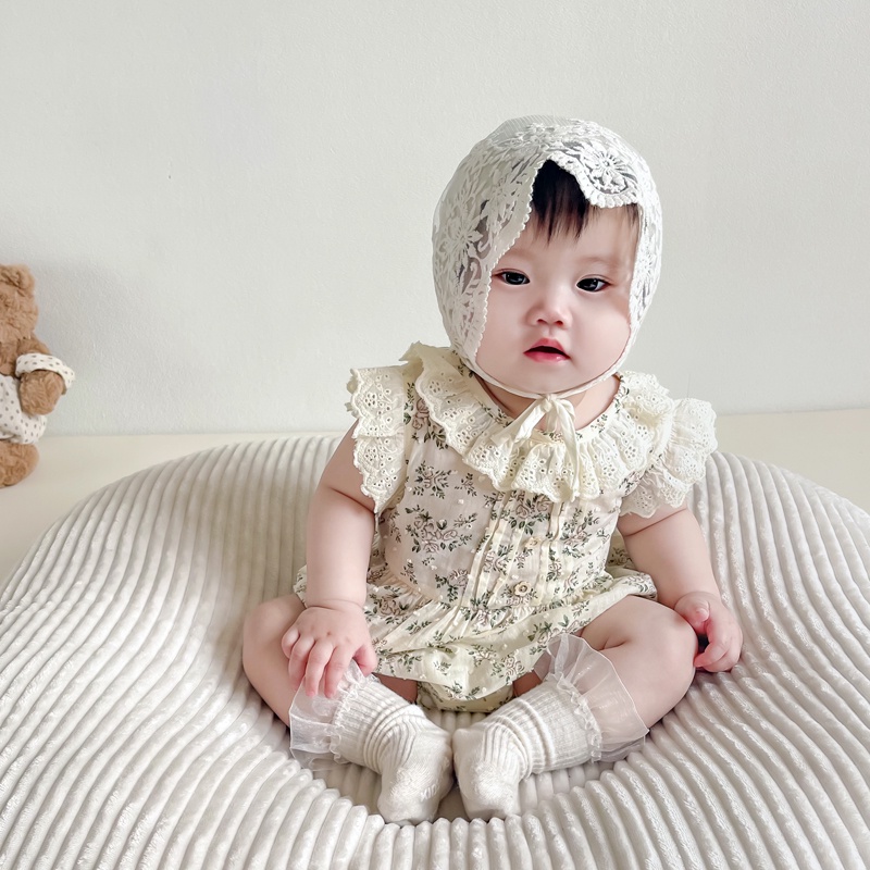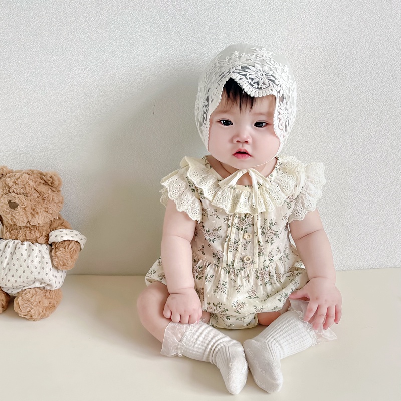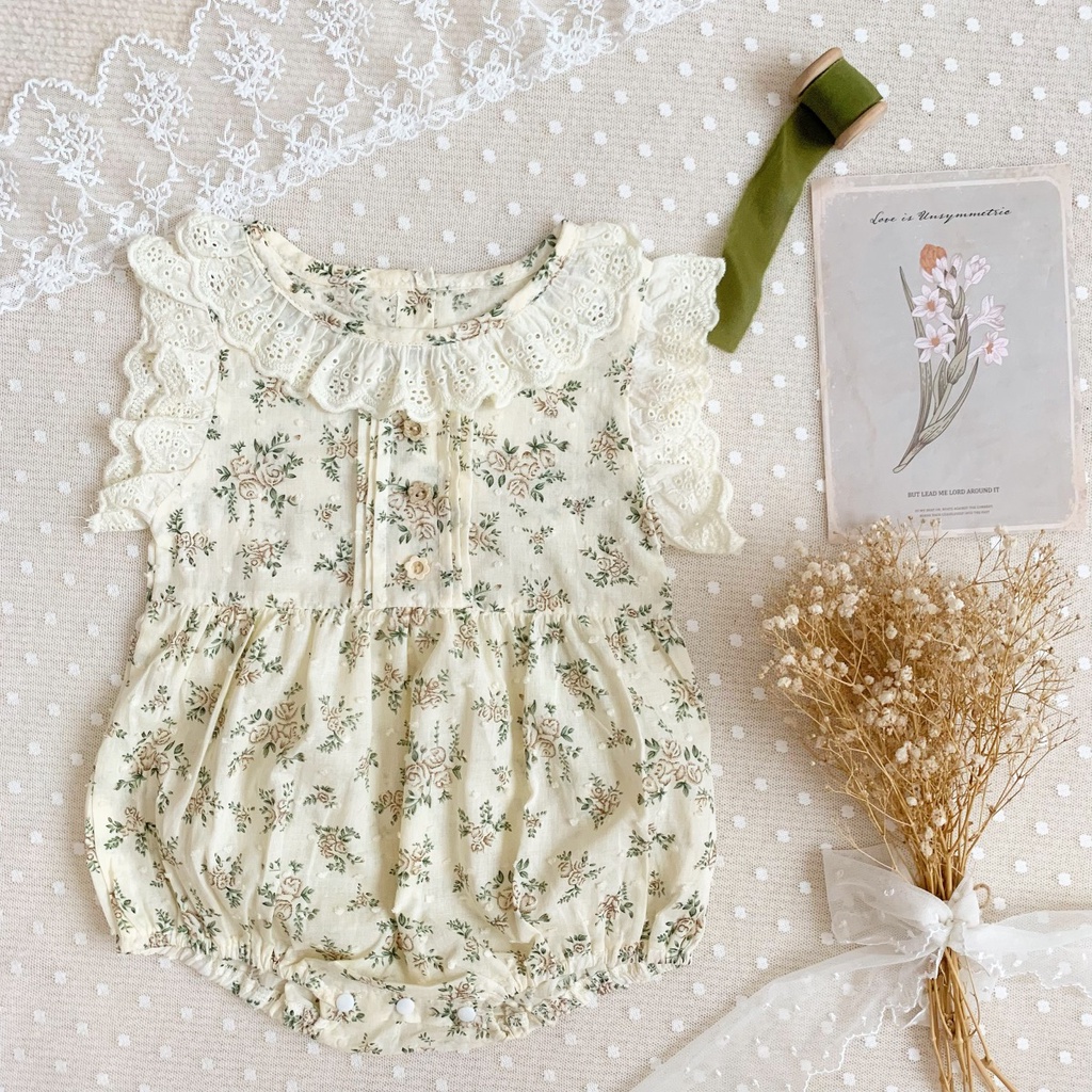 Flm ชุดจั๊มสูทรอมเปอร์ แขนสั้น ผ้าฝ้าย ลายดอกไม้ ลูกไม้ น่ารัก แฟชั่นฤดูร้อน สําหรับเด็กผู้หญิง อายุ 0-24 เดือน