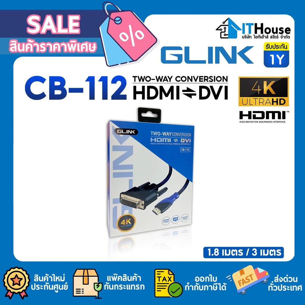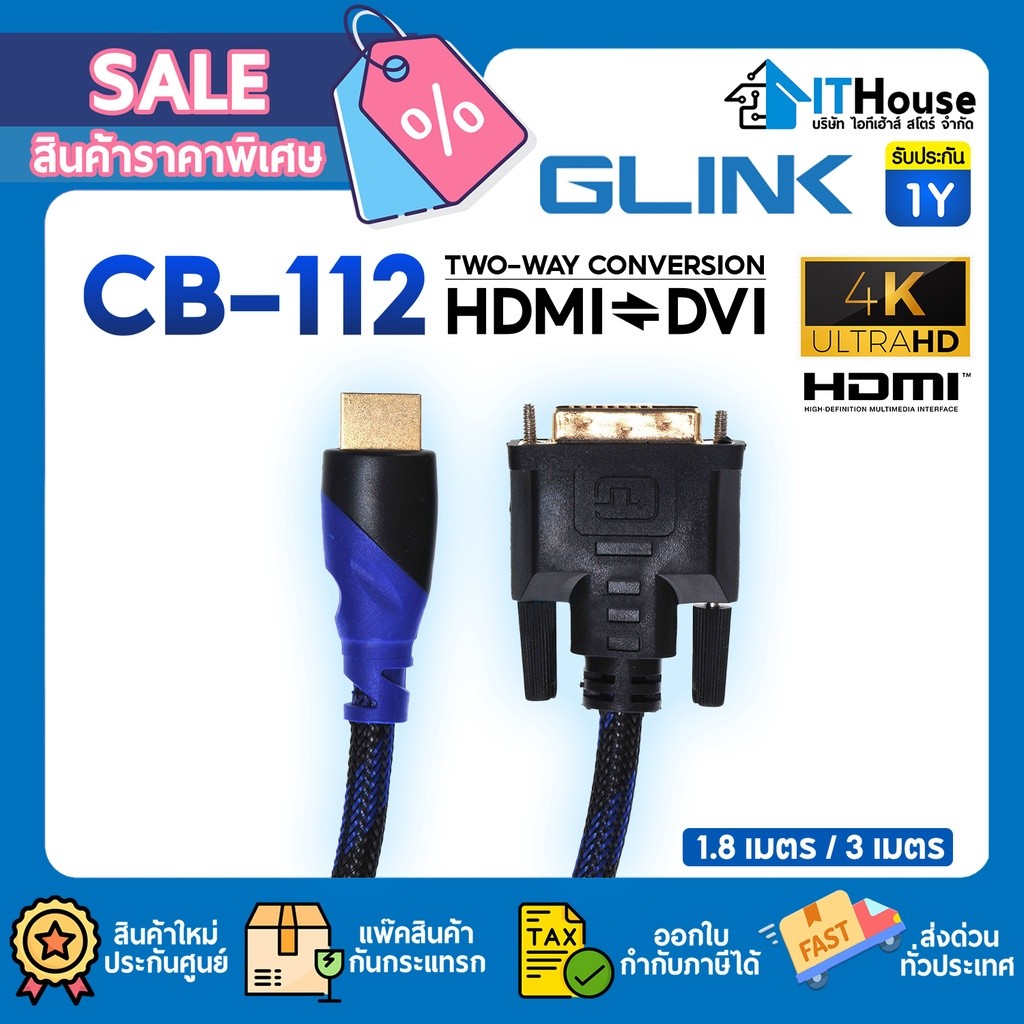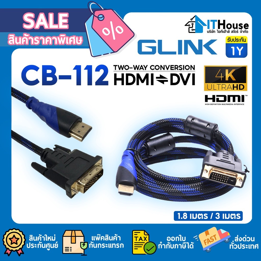 🌈GLINK CB-112🔌สายแปลง HDMI เป็น DVI ยาว 1.8M/3M สายถักหนาอย่างดี ส่งสัญญาณภาพคมชัดสูงสุดถึง 4K เร็ว แรง และเสถียร 🔥