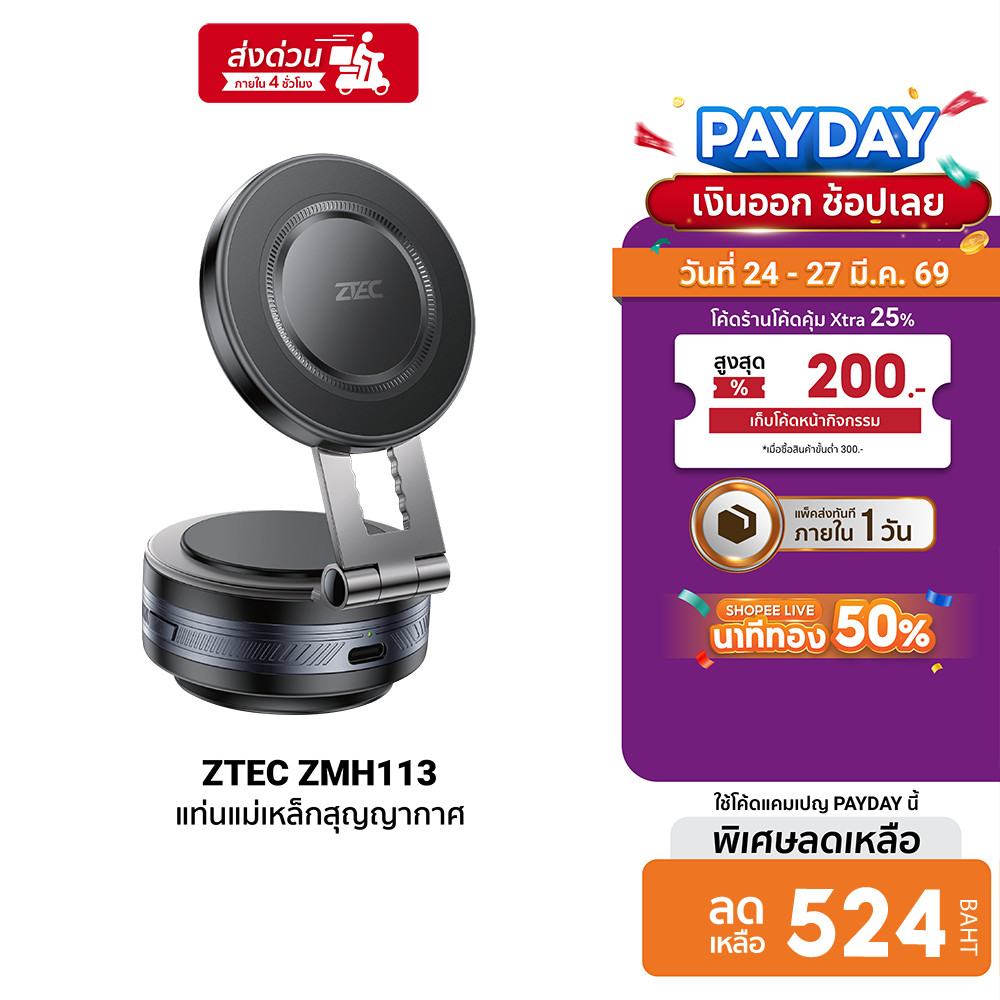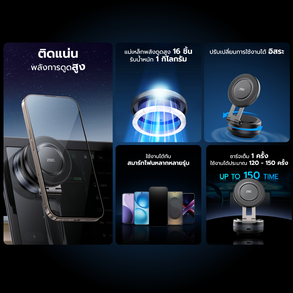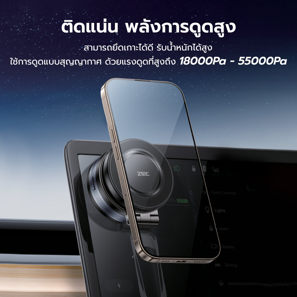 [ลดเหลือ 524] ZTEC ZMH113 แท่นแม่เหล็กสุญญากาศ ติดมือถือ พลังการดูดสูง 18000Pa - 55000Pa รับน้ำหนัก 1 กก. -1Y