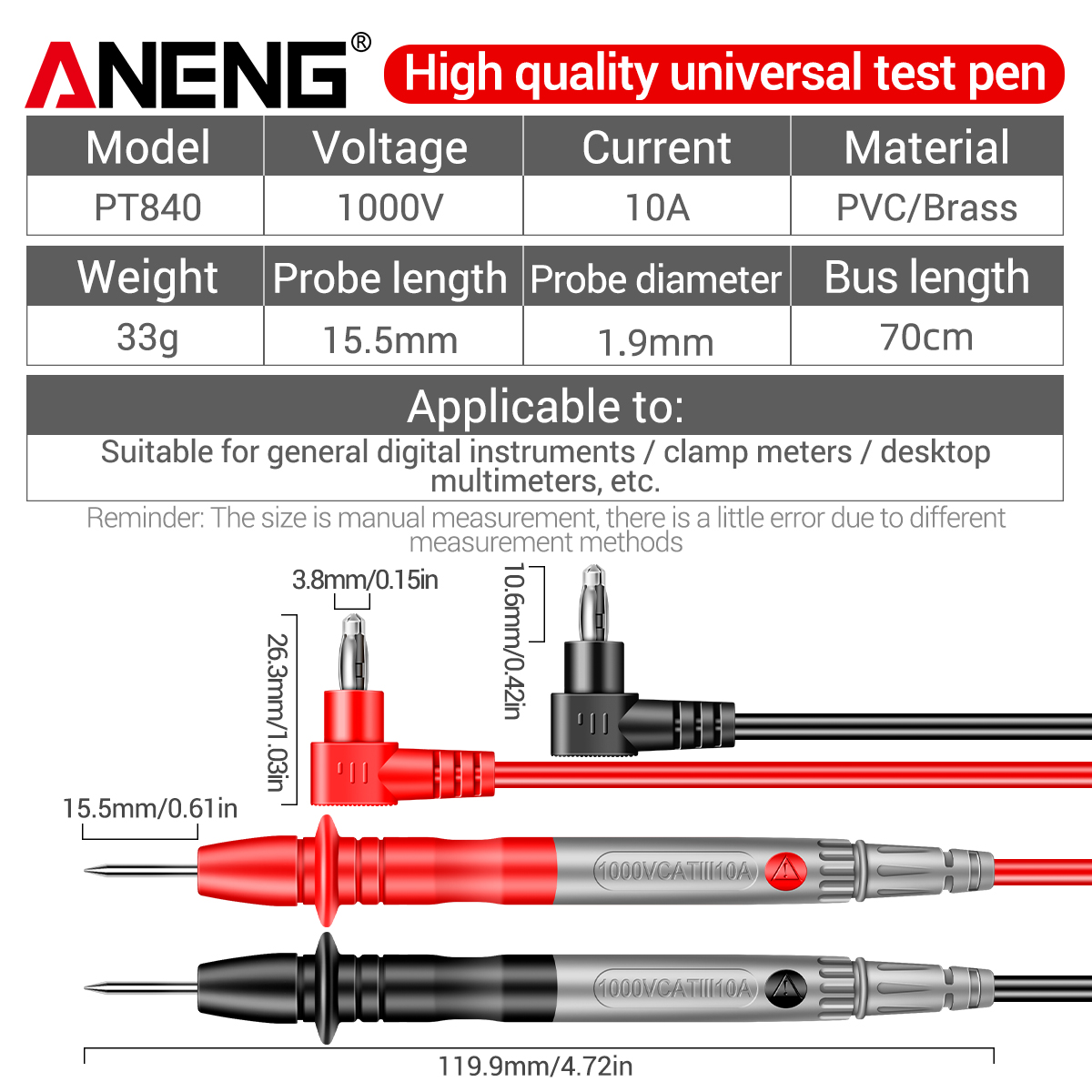 ANENG PT840 Premium Test Lead Kit 1000V 10A มัลติมิเตอร์ Probes พร้อมเข็ม Pins และสายเคเบิลแบบยืดหยุ่น 1 ชุด