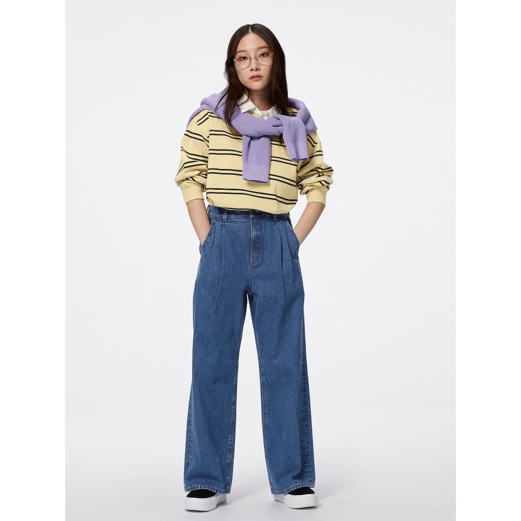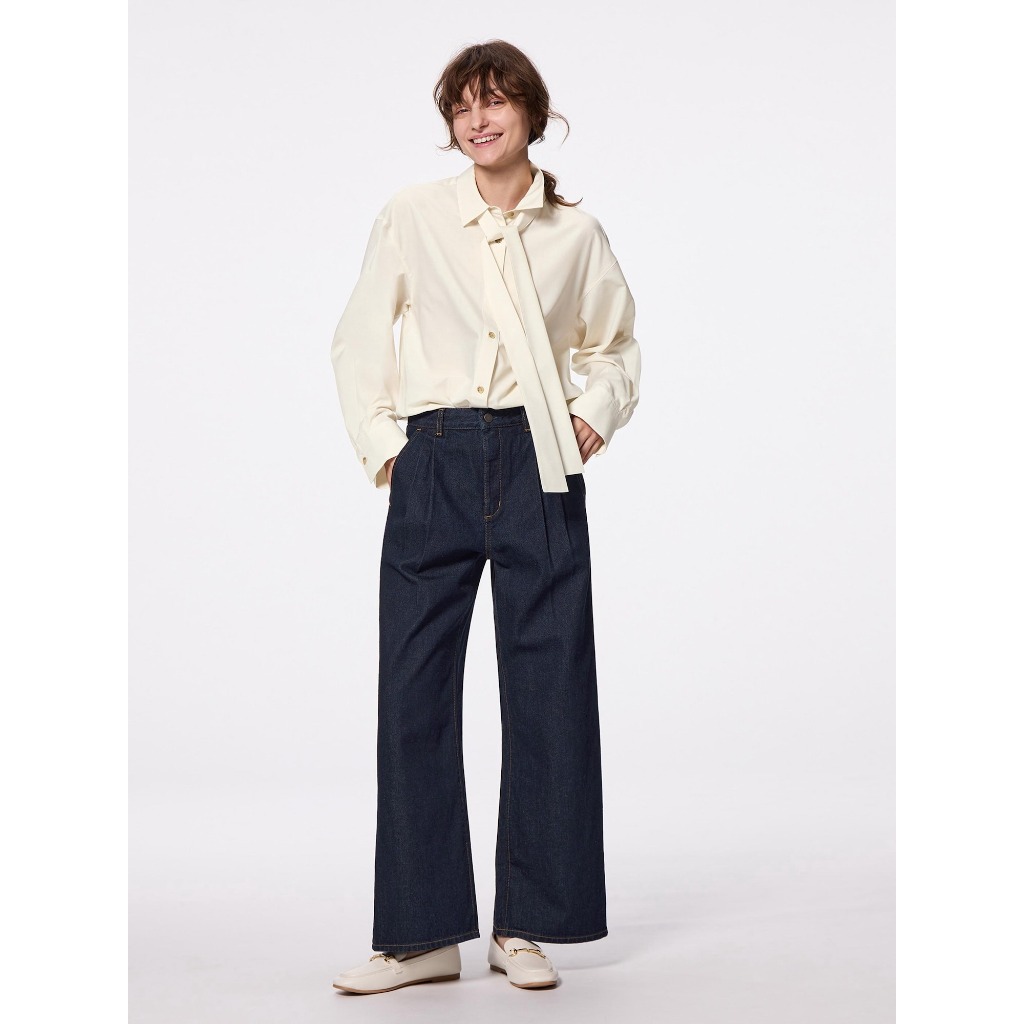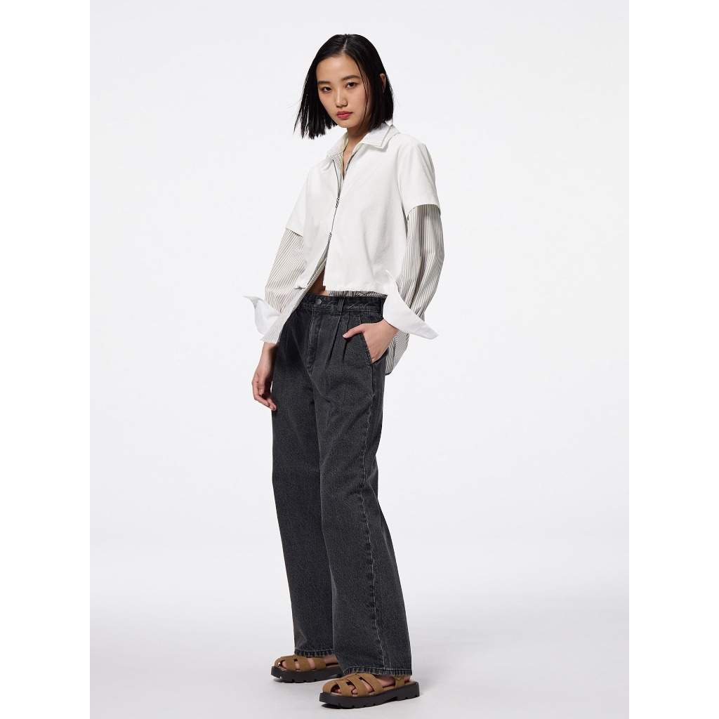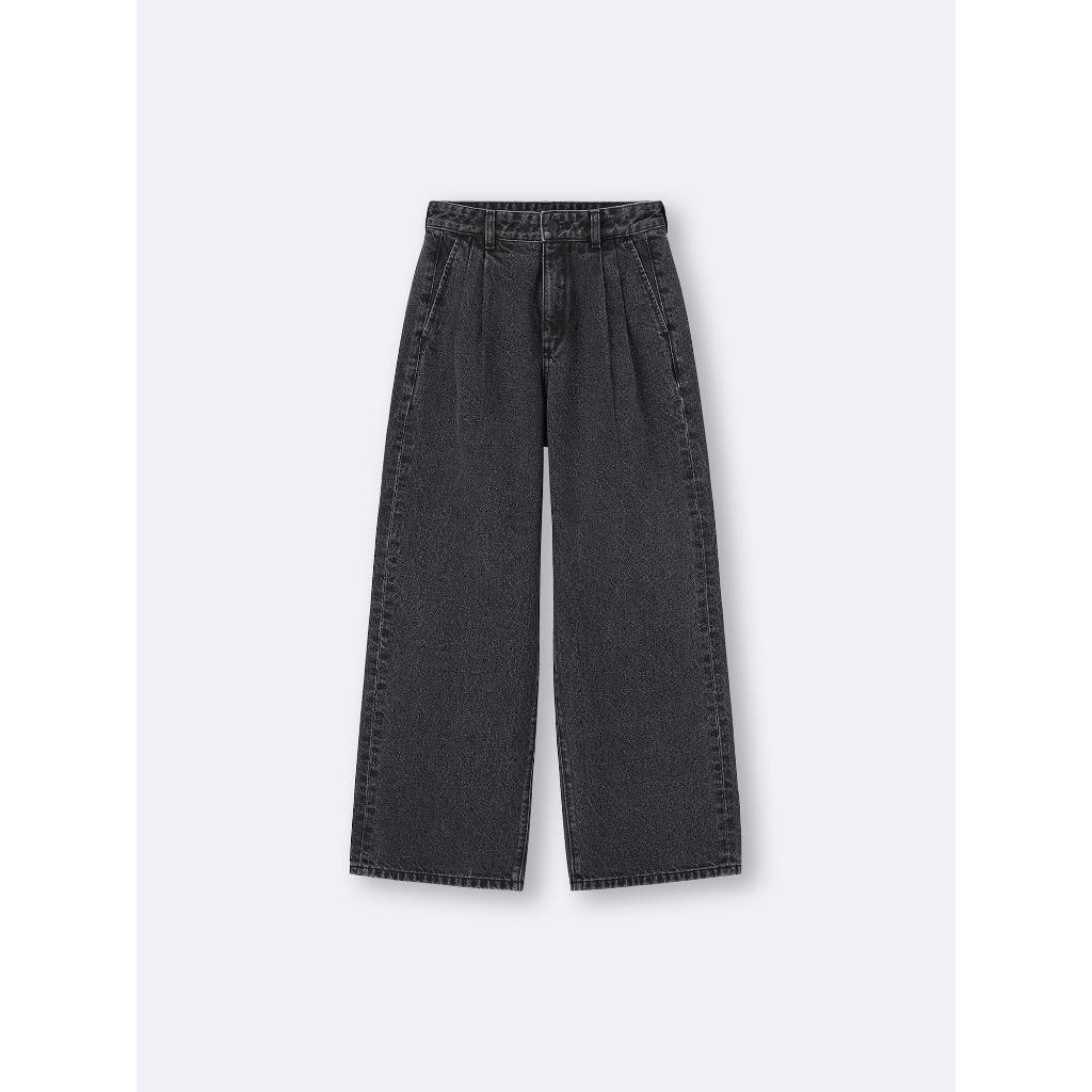 GU (พร้อมส่ง) กางเกงผ้าเดนิมส์ จับจีบ ทรงขากว้างตรง เอวสูง /GU Denim Tuck Trouser