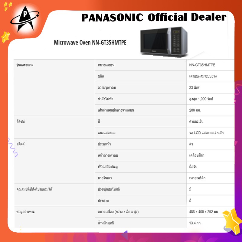 Microwave +Grill เตาอบ ไมโครเวฟ +ระบบย่าง พานาโซนิค รุ่น NN-GT35HMTPE ขนาด 23 ลิตร Panasonic