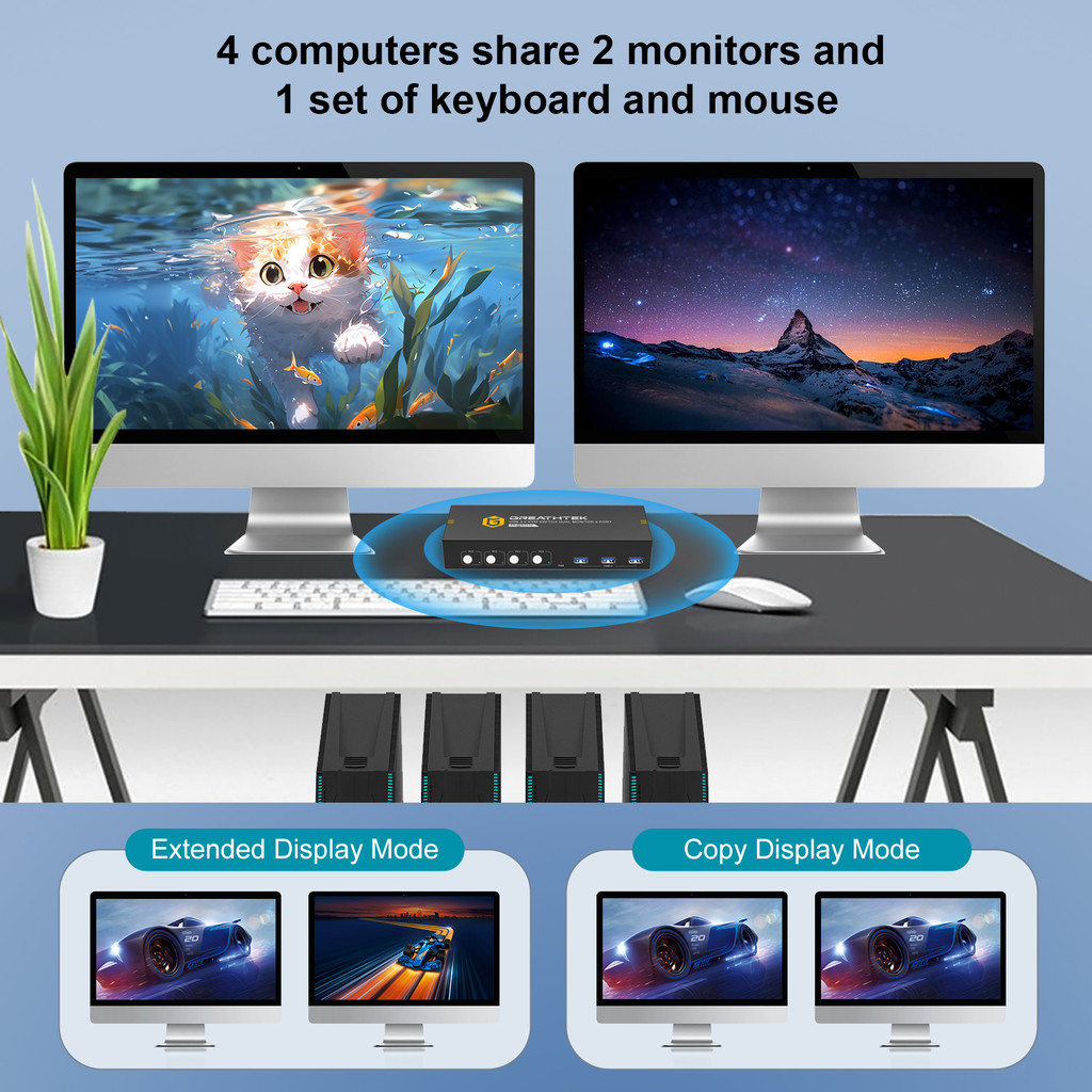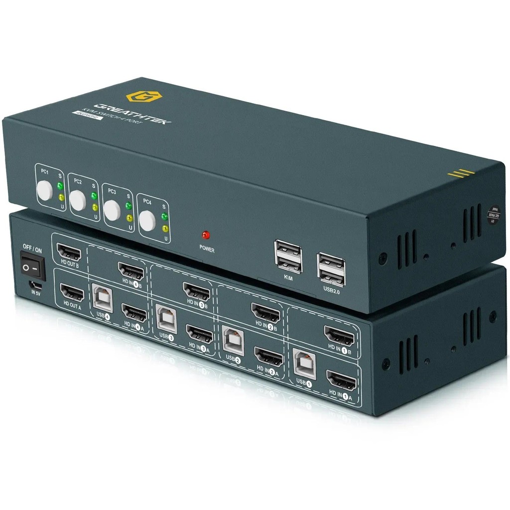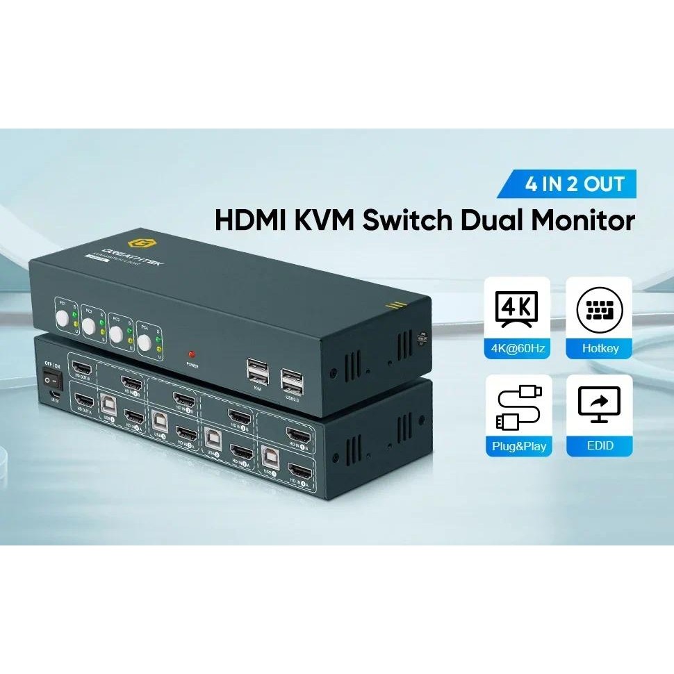 USB KVM สําหรับจอภาพคู่ 4 พอร์ต HDMI 4K 60Hz. สวิทช์ระหว่าง 4 ชิ้น และ ควบคุม 2 จอภาพ เหมาะสําหรับ Multitaskers