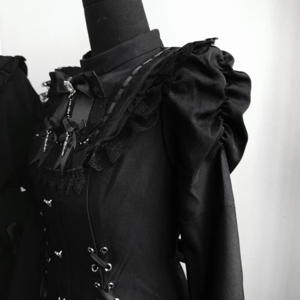 Sweet Lolita Bow Lace Long Sleeve Short Dress Fashion เอว Slimming Dark Style Dress