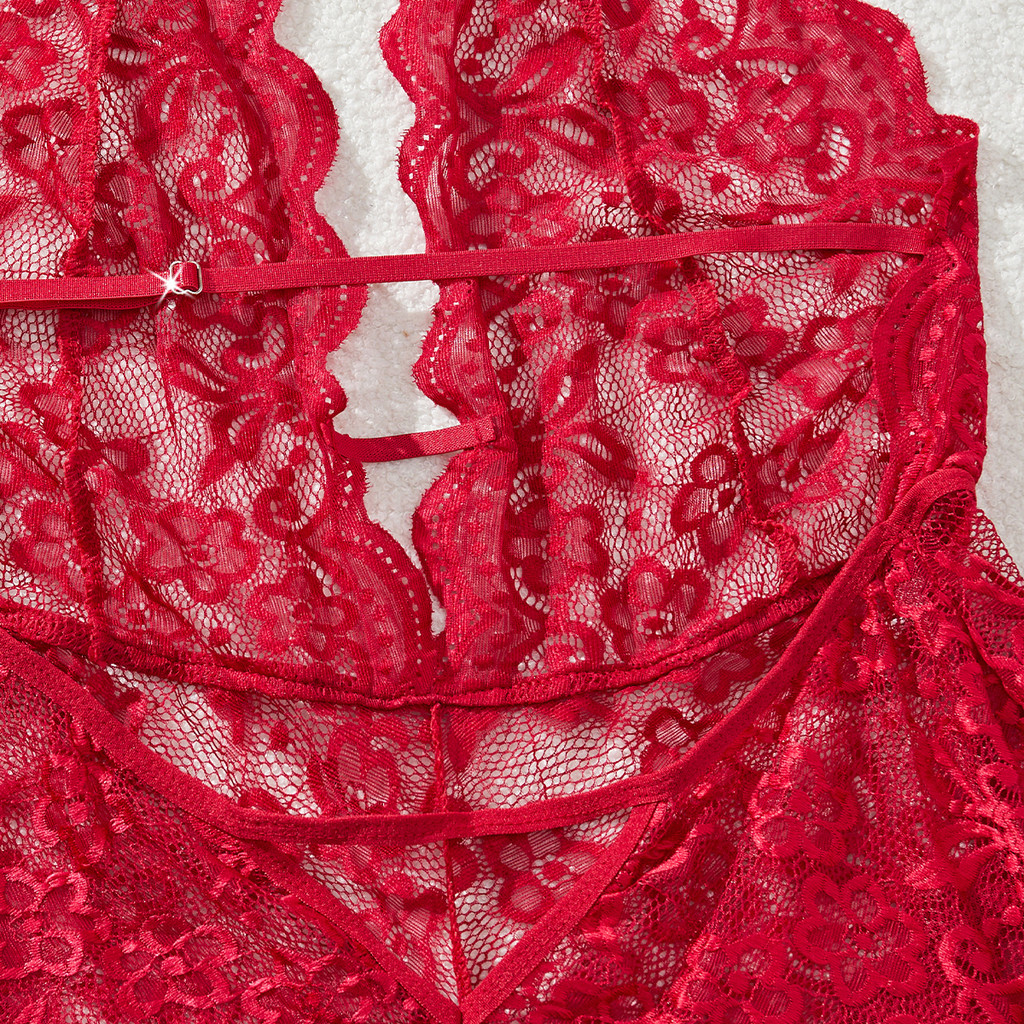 ชุดชั้นในแบบบอดี้สูทสำหรับผู้หญิง ไซส์พิเศษ XL สีแดงโปร่งแสง มีลายลูกไม้