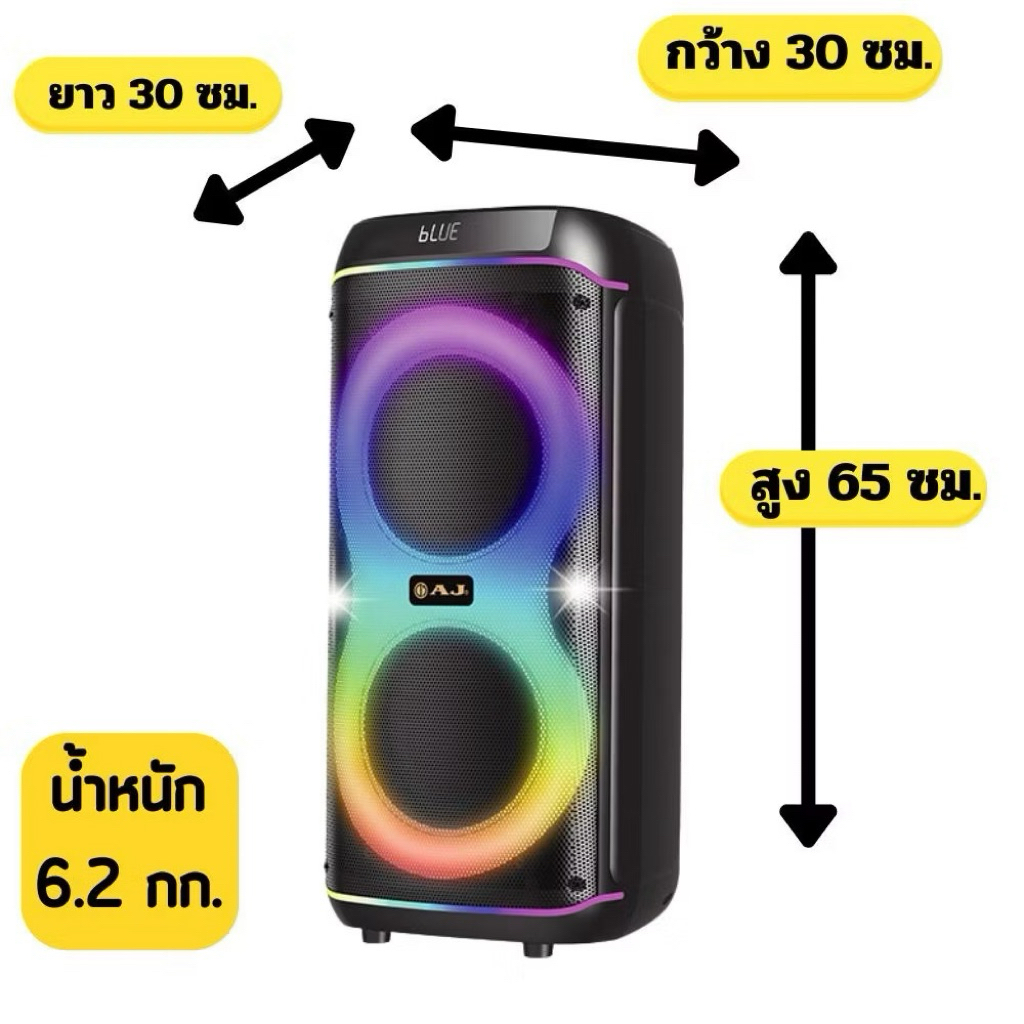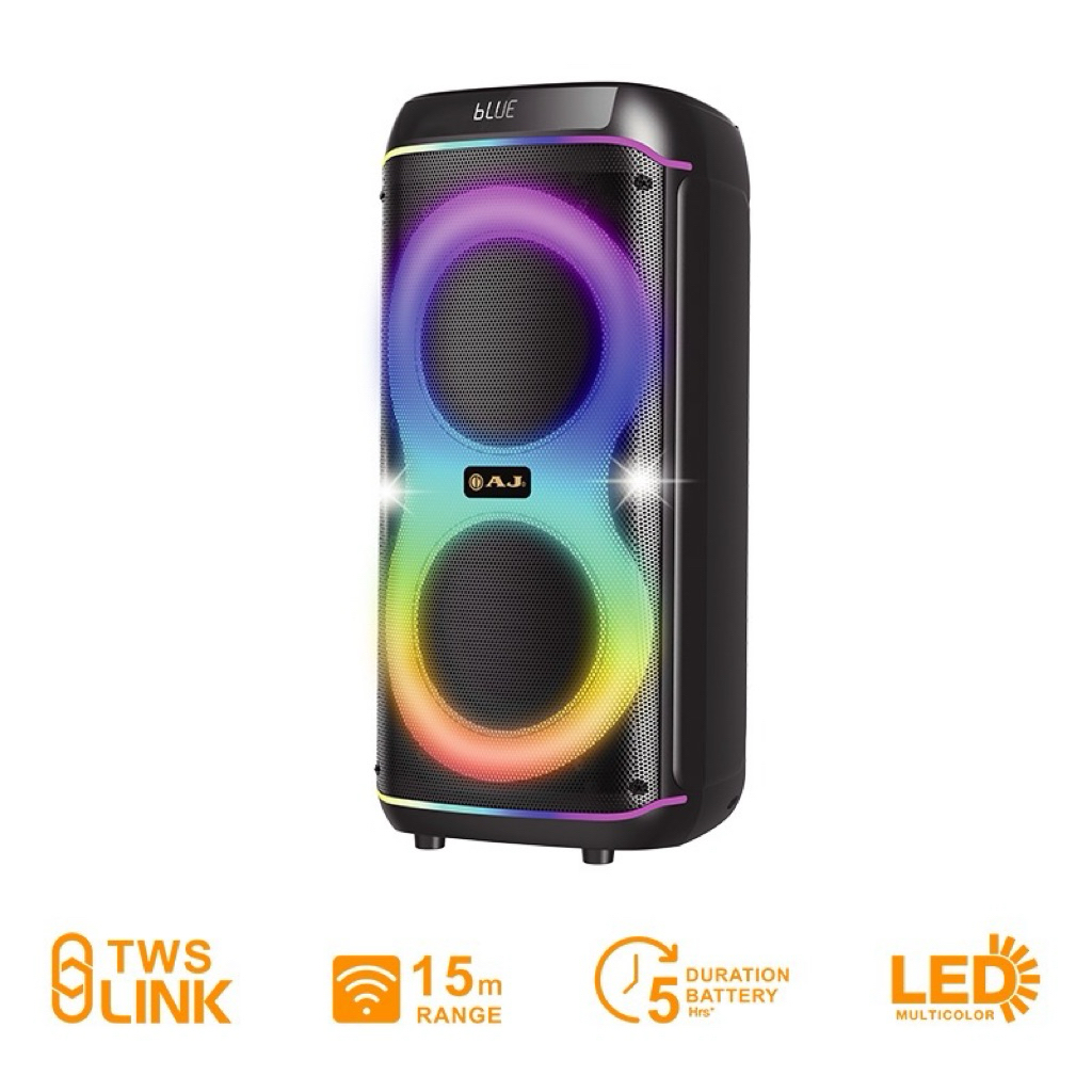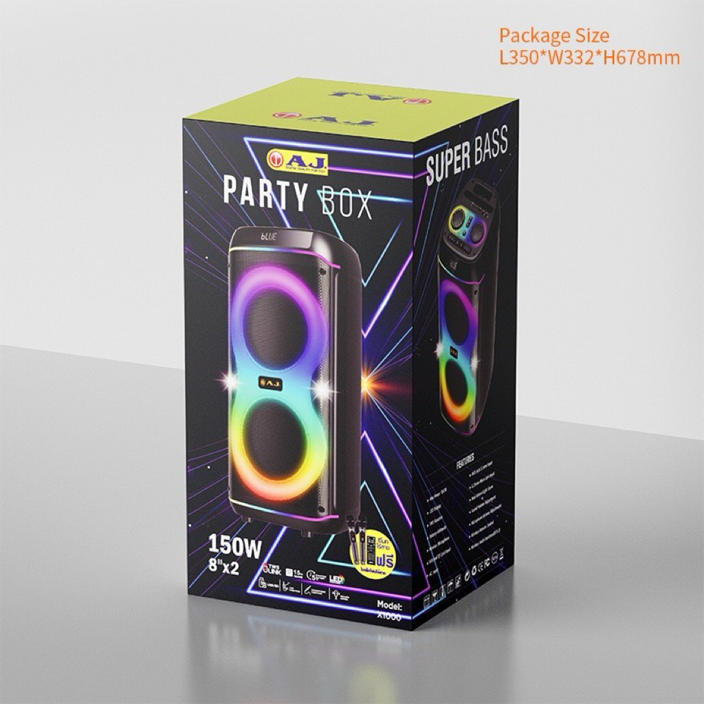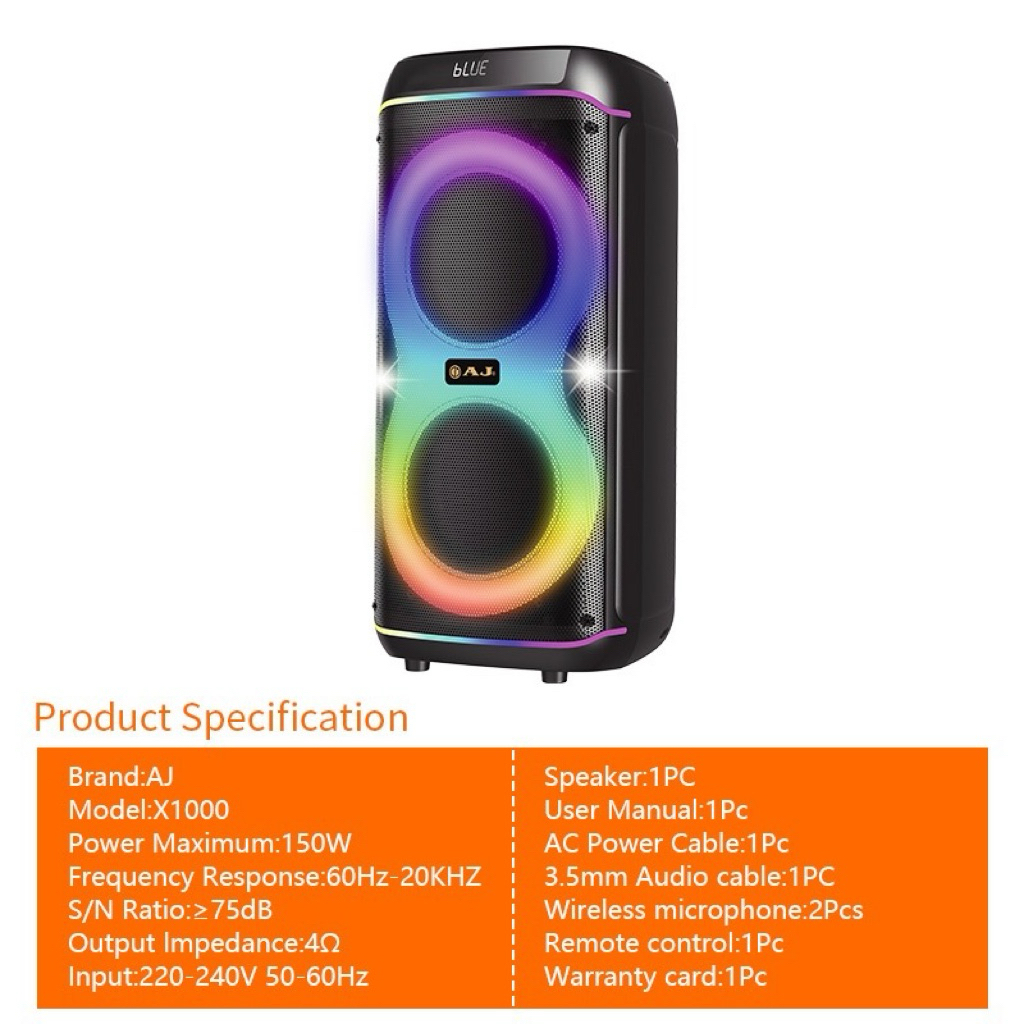 ลำโพงบลูทูธAJ รุ่น X1000 กำลังขับ 150W ดอกลำโพง 8นิ้ว * 2ดอก แถมไมค์ลอย 2 ตัว แบตเตอรี่4000mah รับประกัน 1ปี