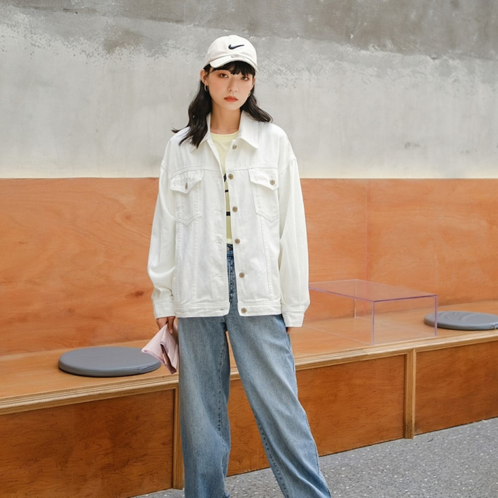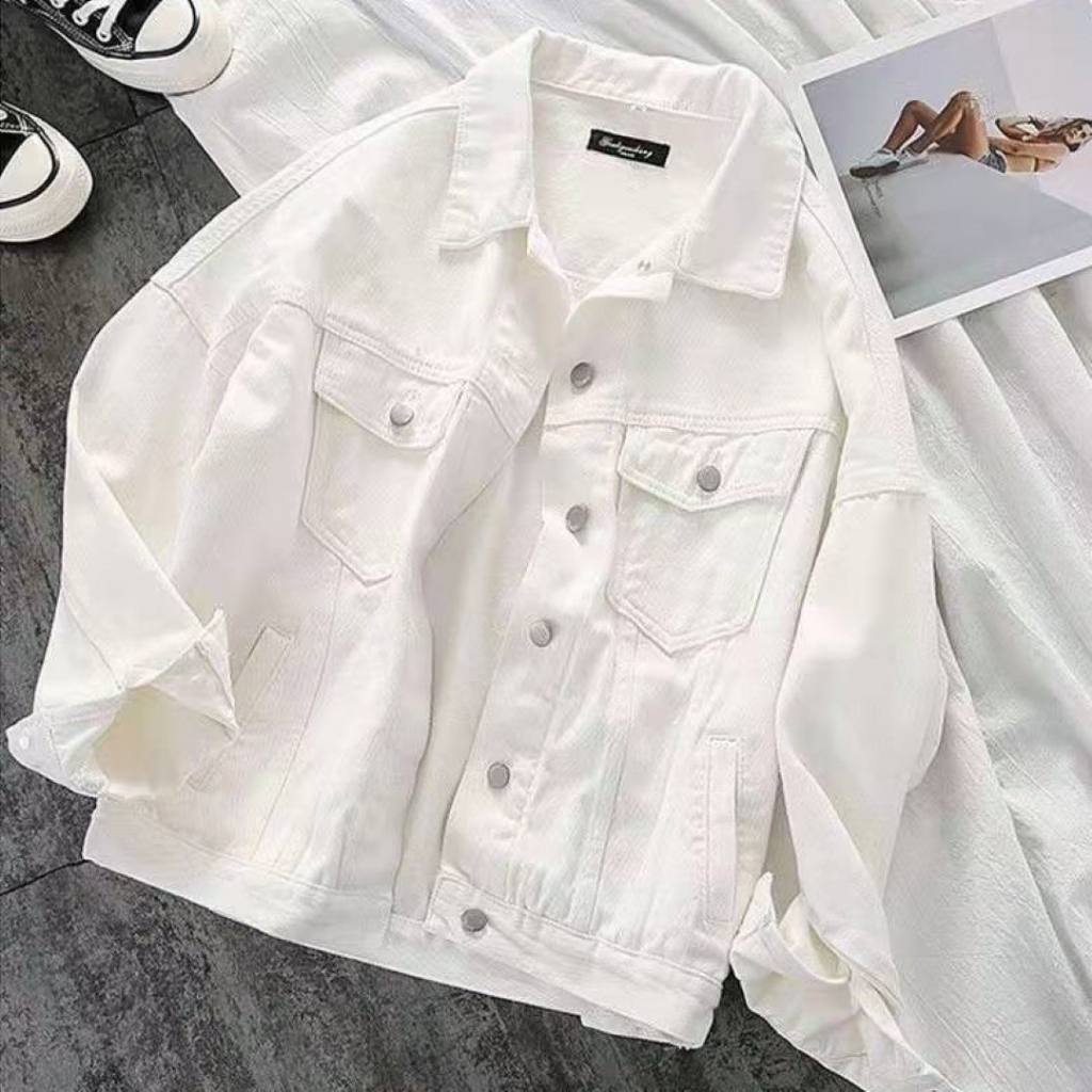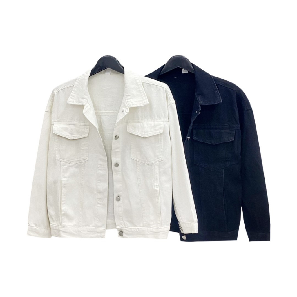 ꕥCatalog Fashionꕥ เสื้อแจ็คเก็ตยีนส์แฟชั่น สีขาวและสีดำ มีกระเป๋าหน้า