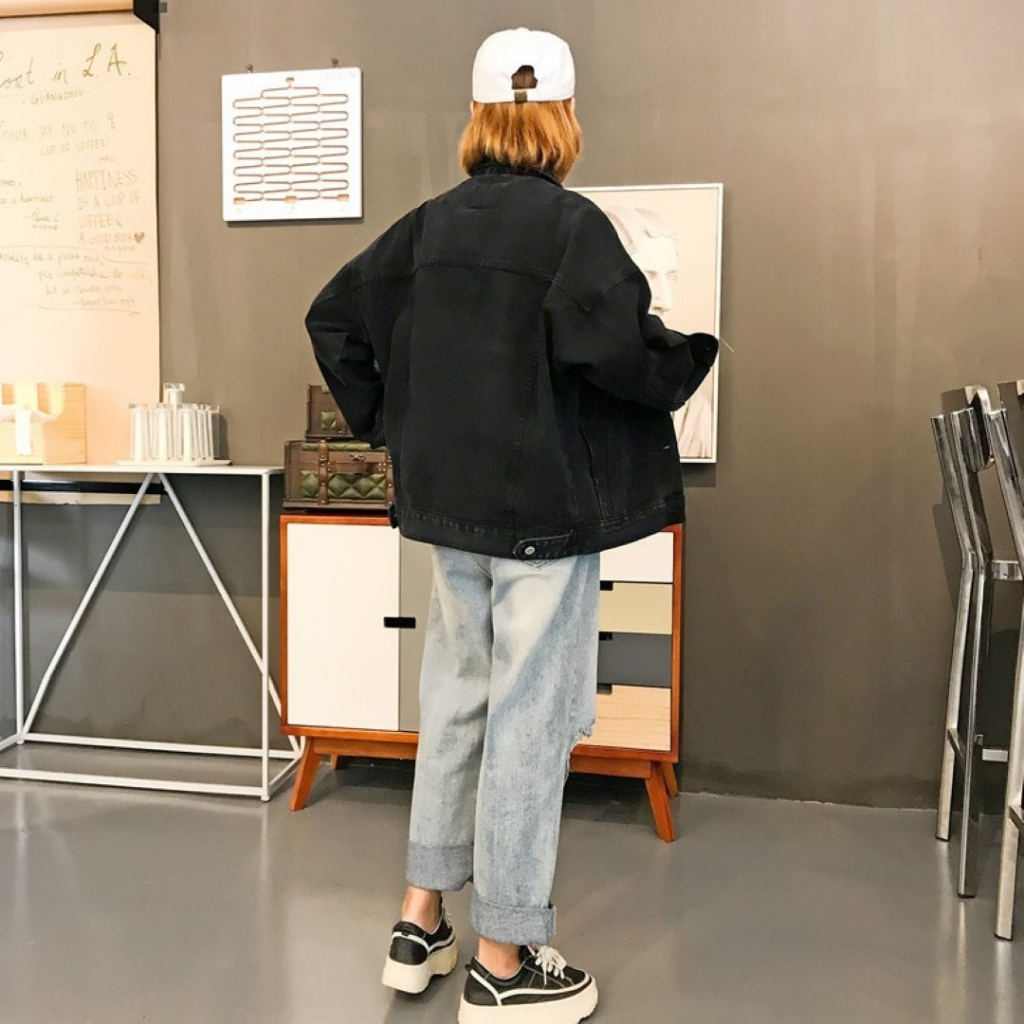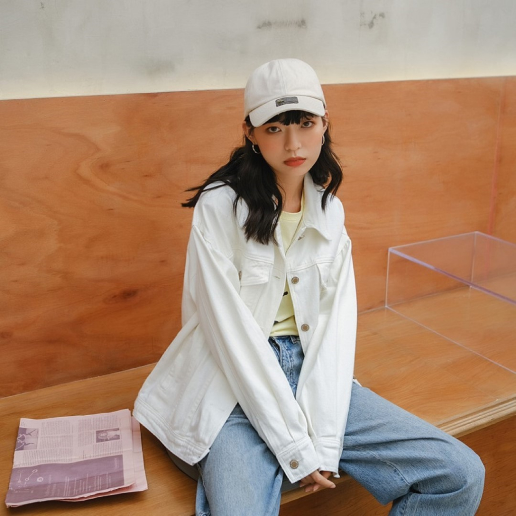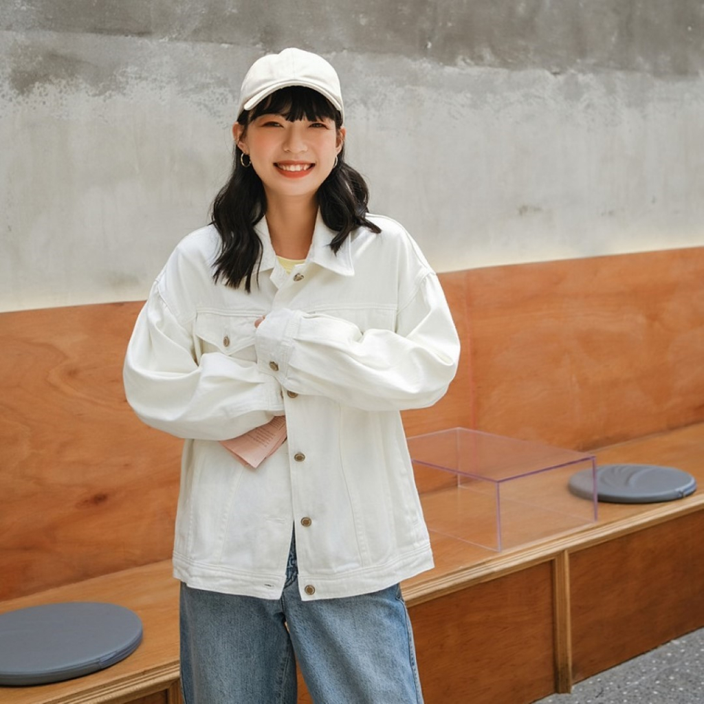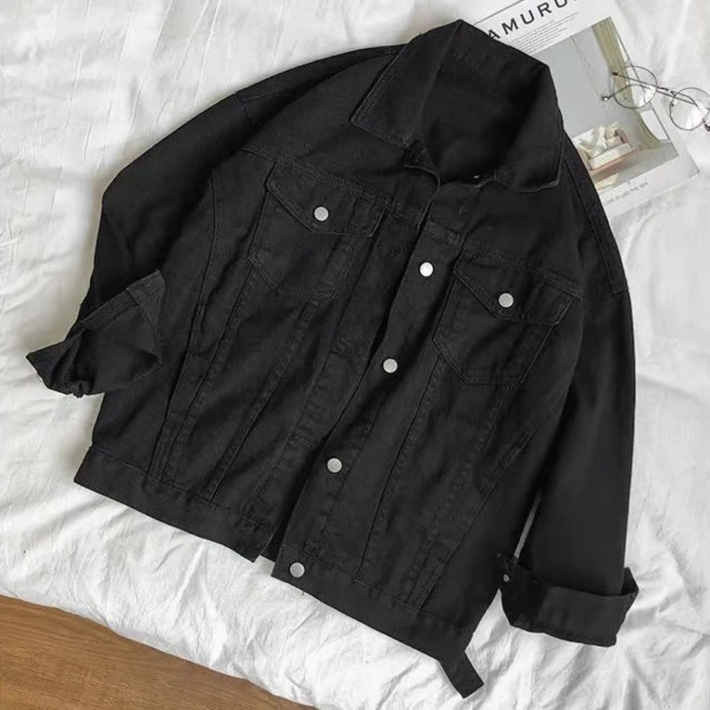 ꕥCatalog Fashionꕥ เสื้อแจ็คเก็ตยีนส์แฟชั่น สีขาวและสีดำ มีกระเป๋าหน้า