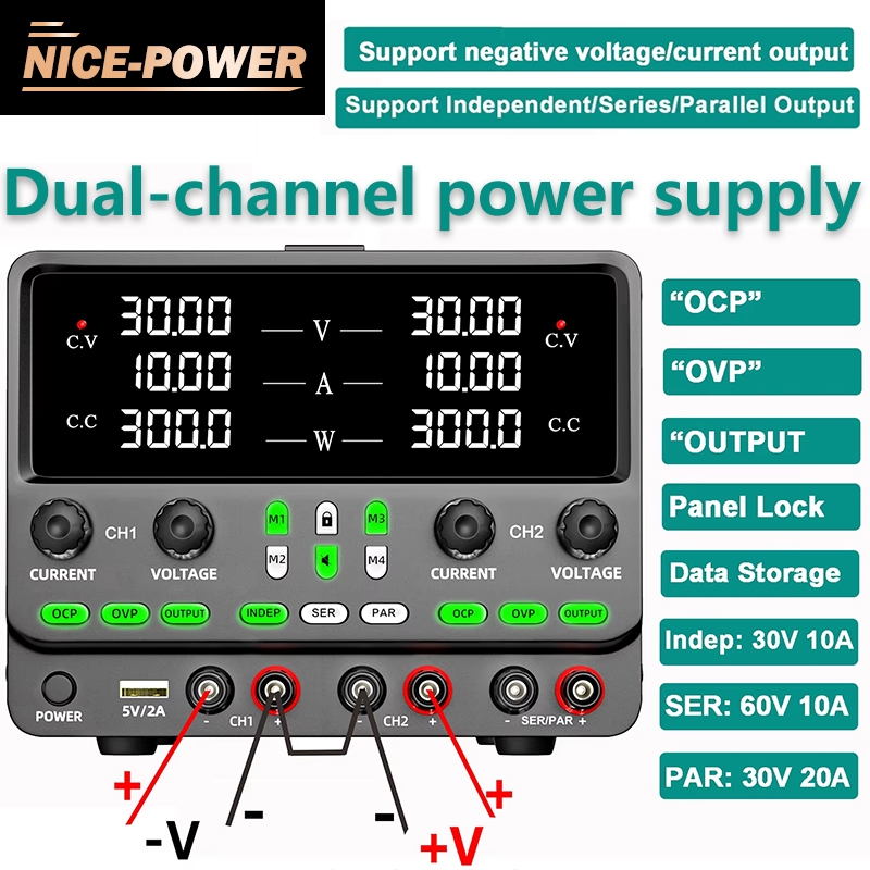 【รับประกันหนึ่งปี】NICE-POWER Dual-Channel DC Lab Power Supply Adjutable 30V10A 20A dc power supply สวิตชิ่งเพาเวอร์ซัพพล SPPS3010-2KD 30V 60V 120V 3A 5A 10A สี่ปุ่มปรับ led DC Power Supply