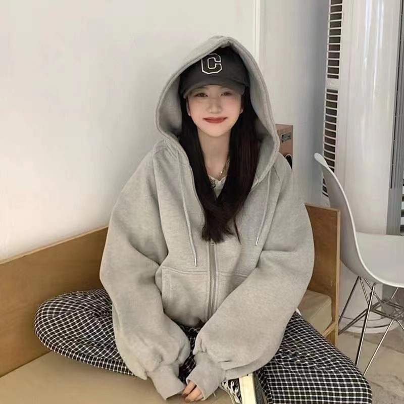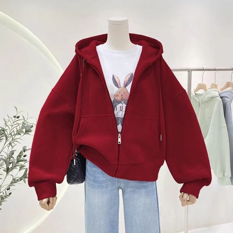เทรนใหม่2026เสื้อกันหนาวสีพื้นหญิง เสื้อคลุมหญิง เสื้อแจ็คเก็ตแขนยาว มีซิป มีฮู้ด