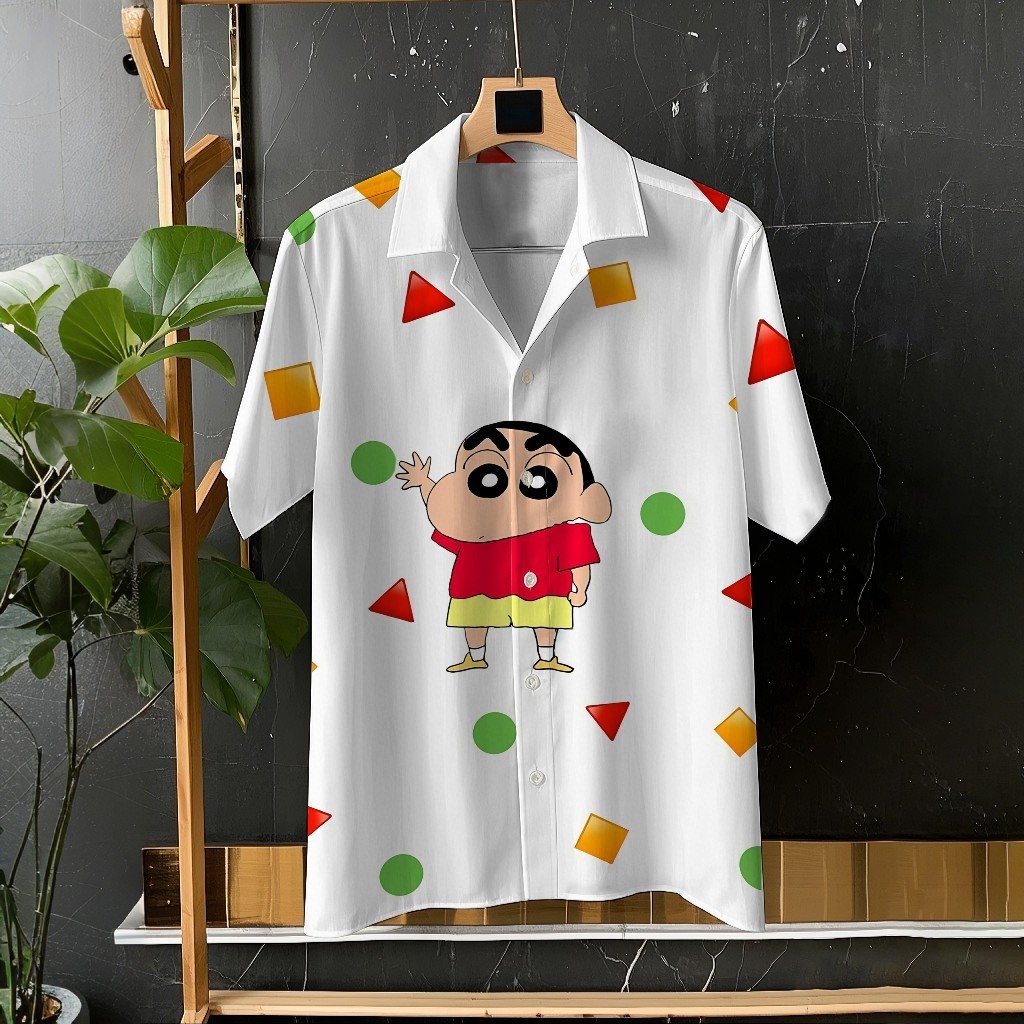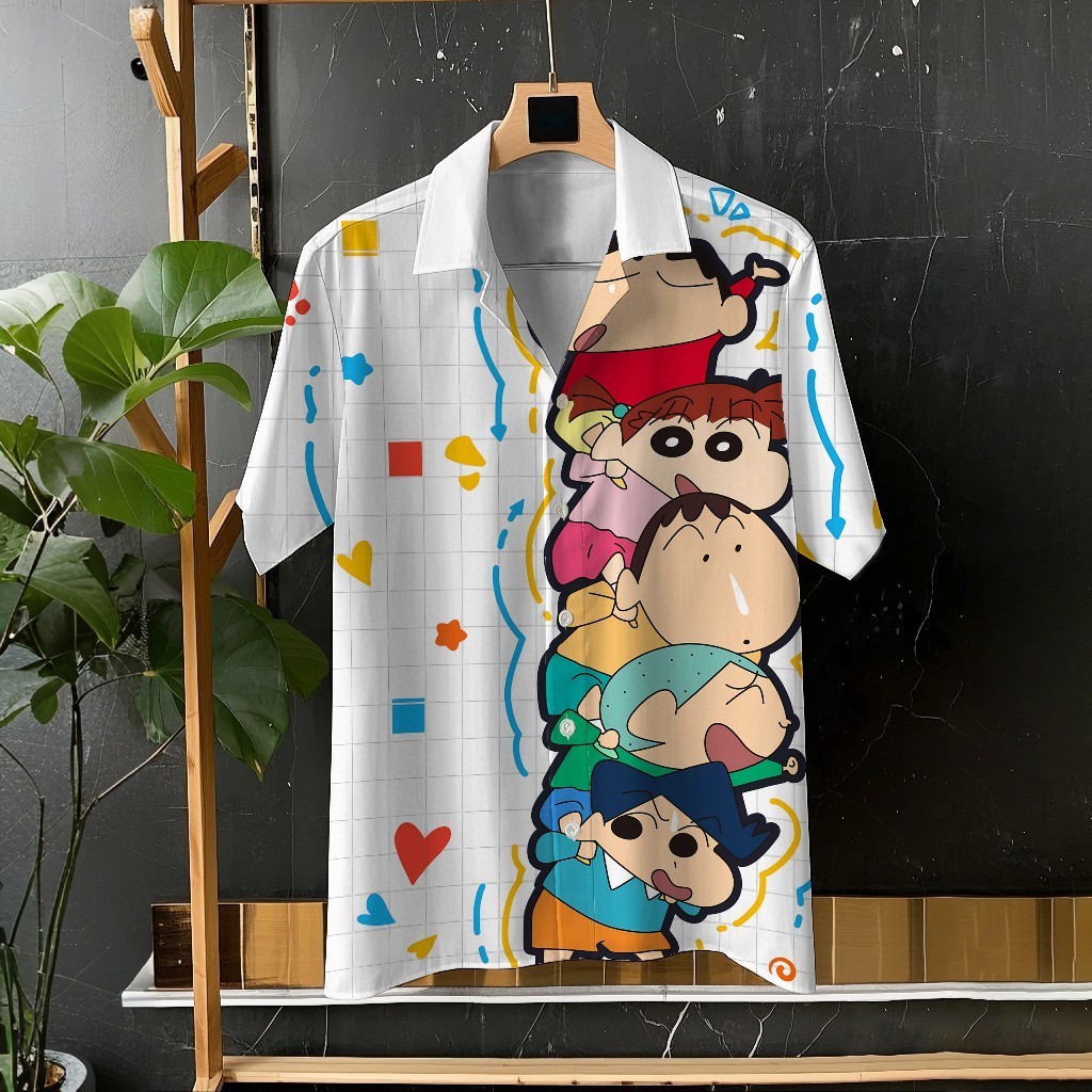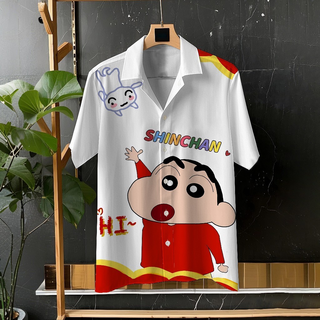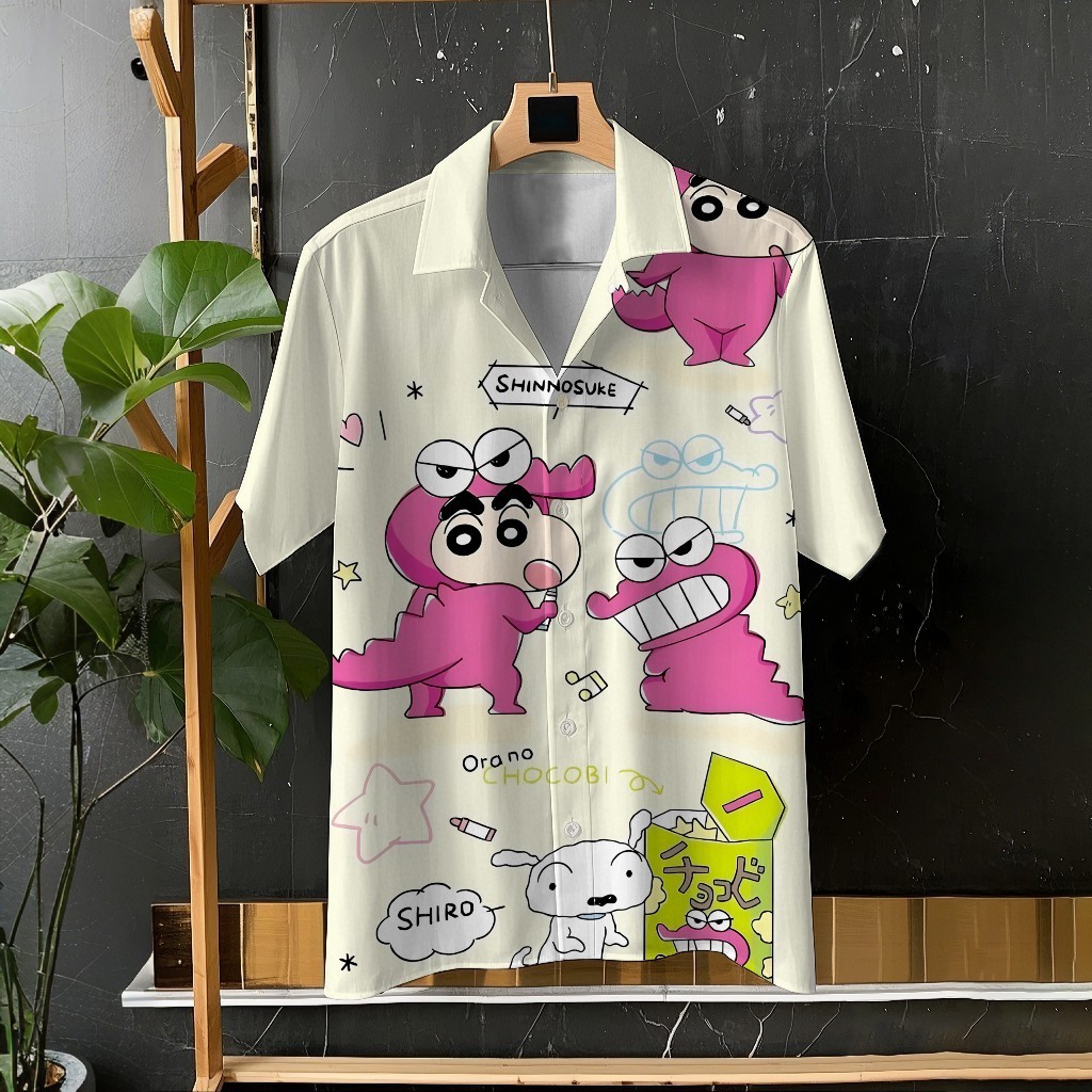 Crayon Shin-chan และ Xiaobai น่ารักการ์ตูนพิมพ์ Unisex เสื้อแขนสั้นเสื้อลำลองทุกวันอเนกประสงค์สบายวันหยุดขนาดใหญ่ S-5XL