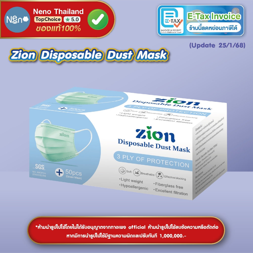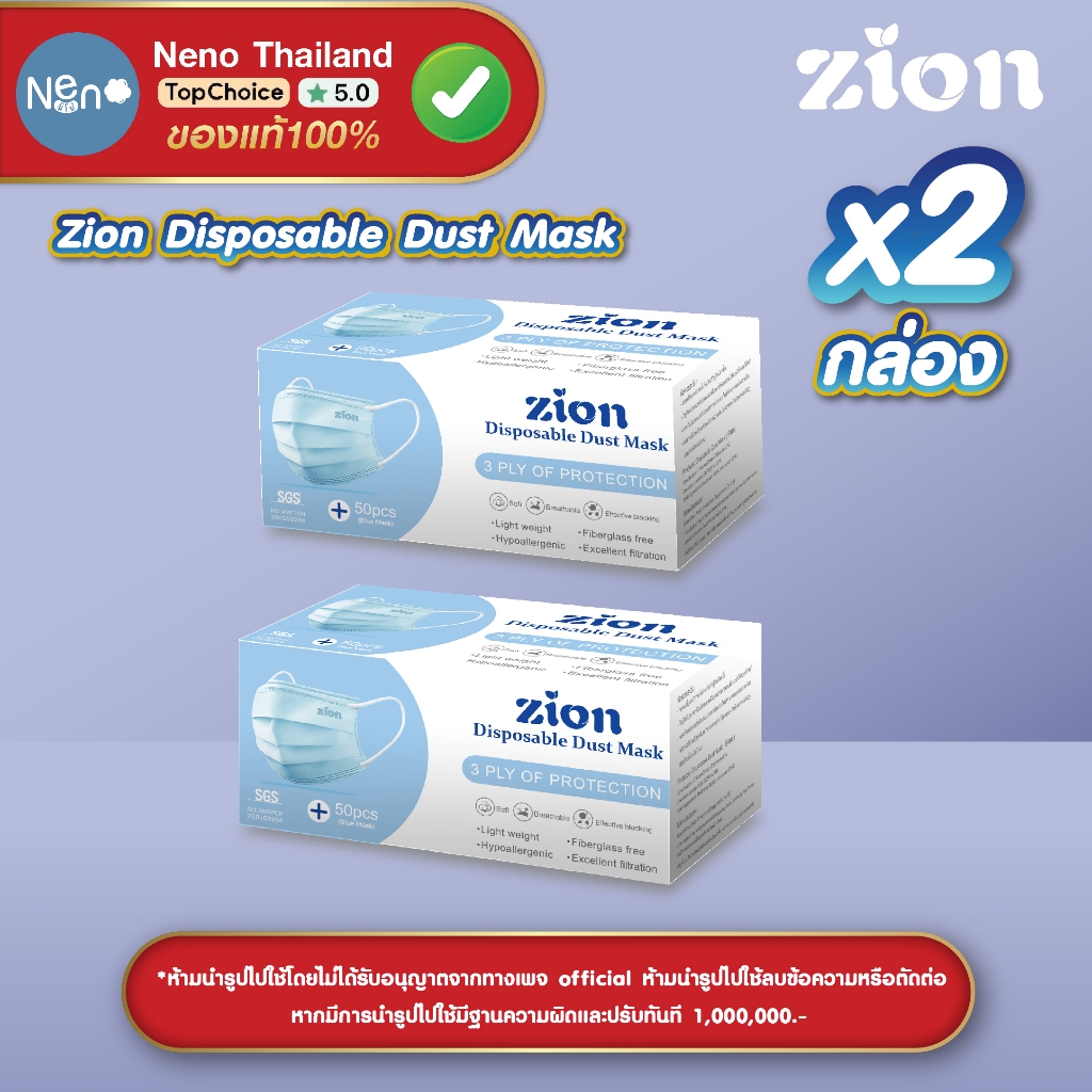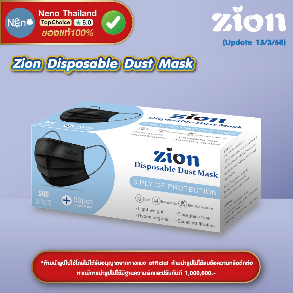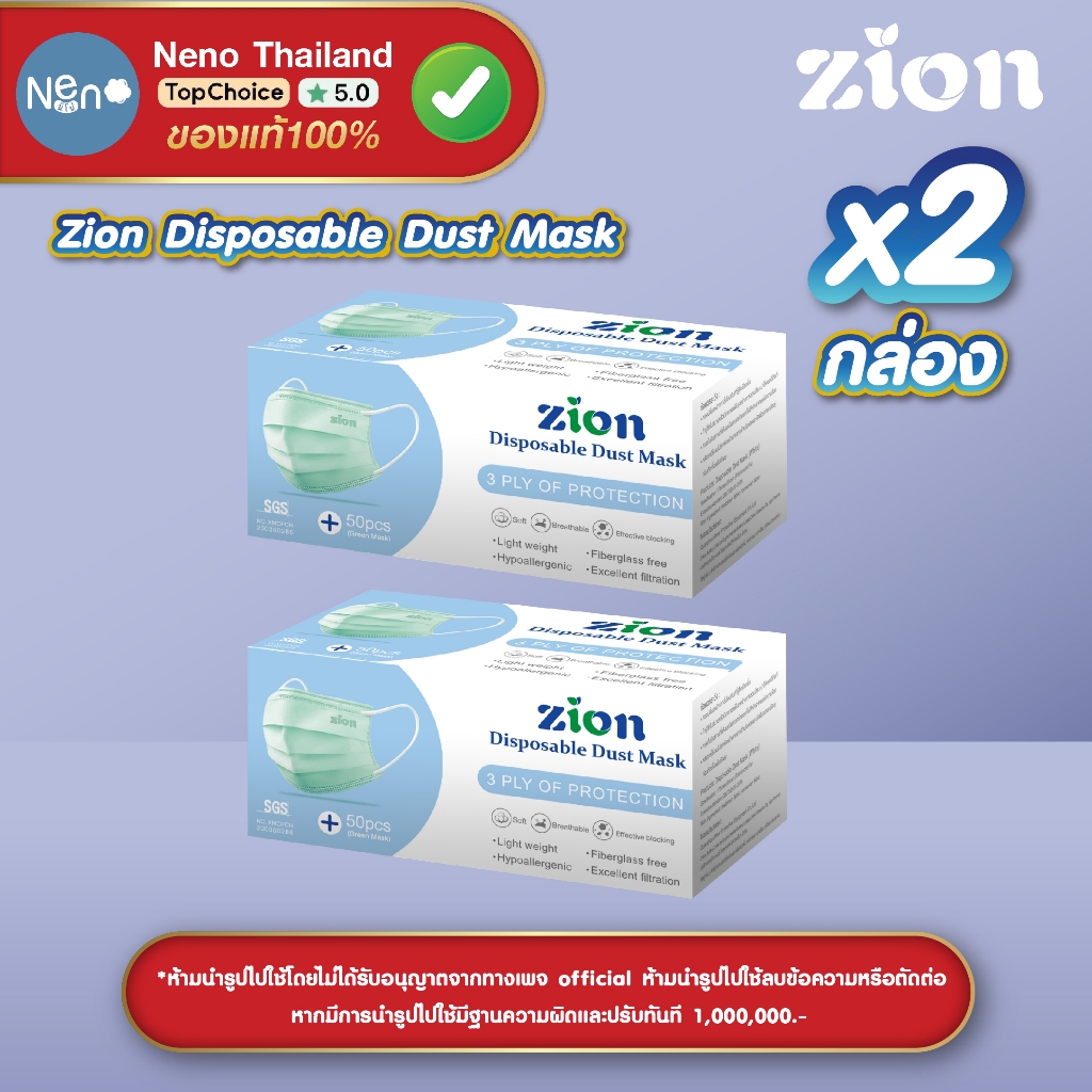 1 กล่อง 50 ชิ้น ZION Mask หน้ากากอนามัยสี หนา 3 ชั้น ป้องกันฝุ่นละออง [ สีฟ้า สีดำ สีเขียว สีขาว ]