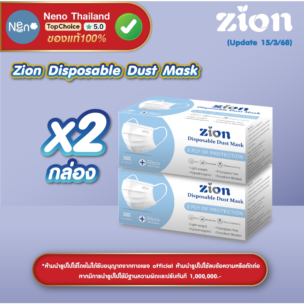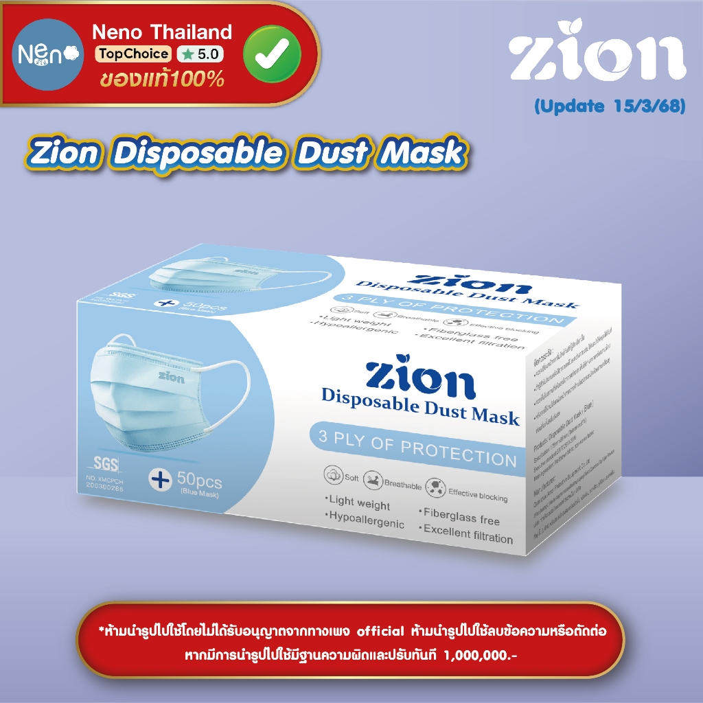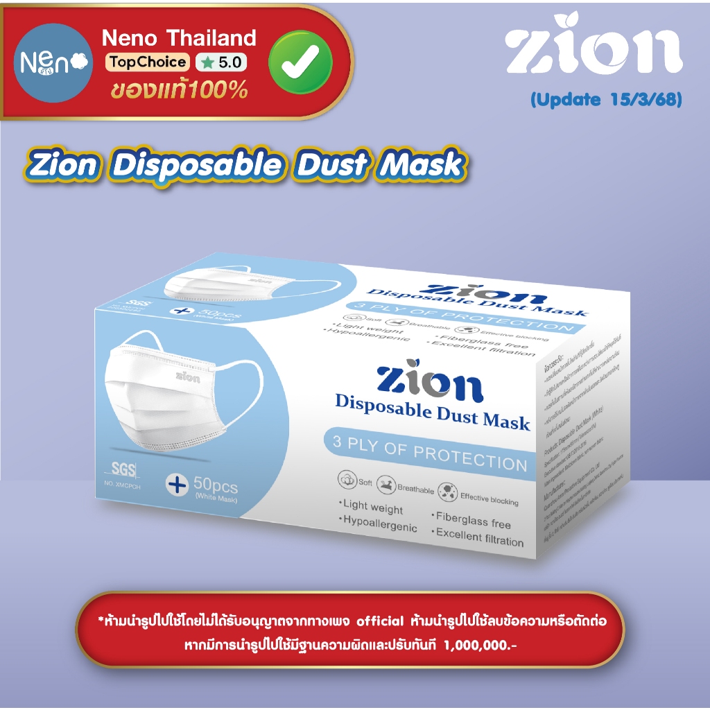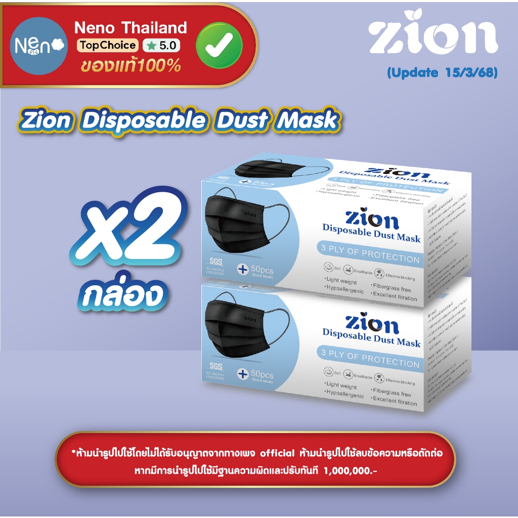 1 กล่อง 50 ชิ้น ZION Mask หน้ากากอนามัยสี หนา 3 ชั้น ป้องกันฝุ่นละออง [ สีฟ้า สีดำ สีเขียว สีขาว ]