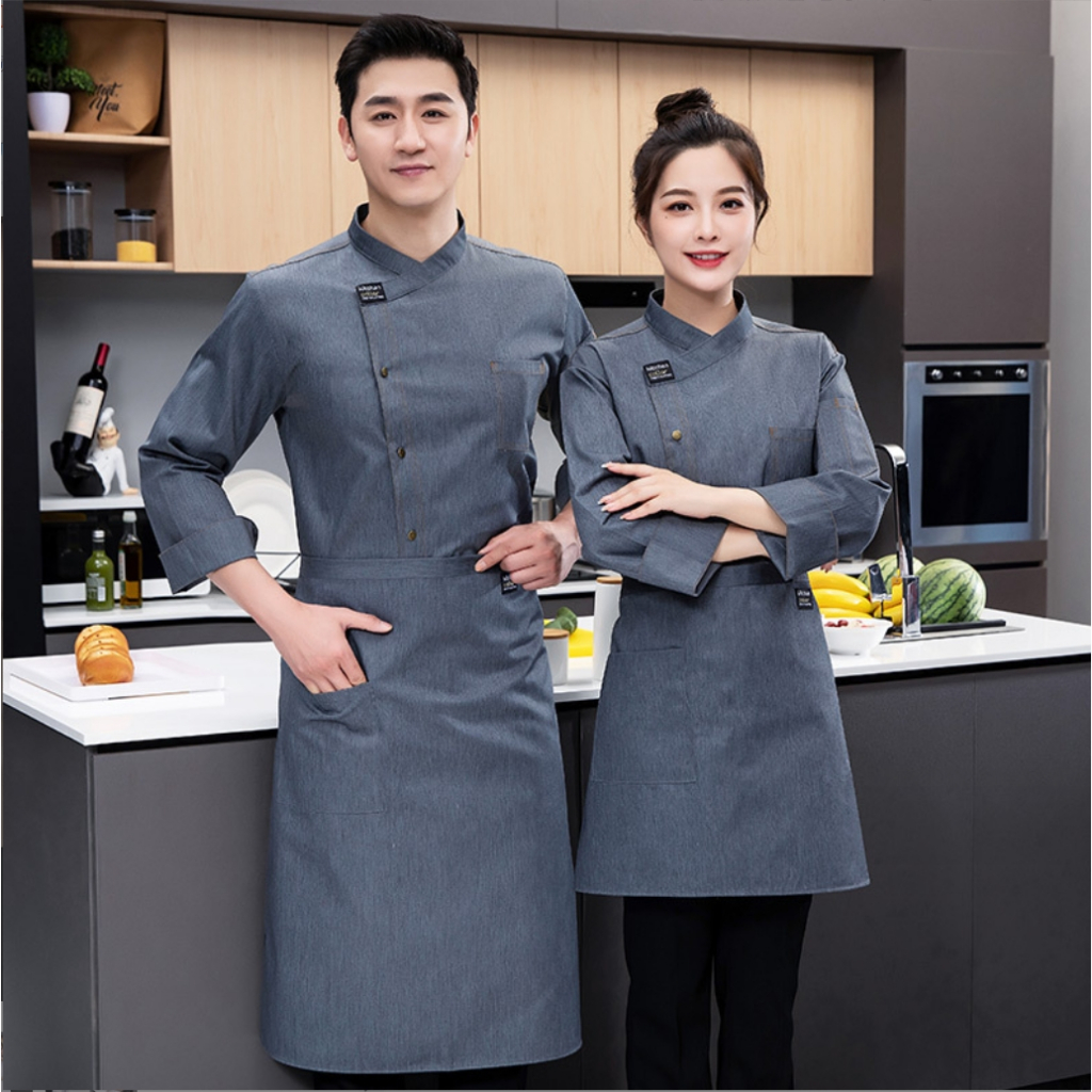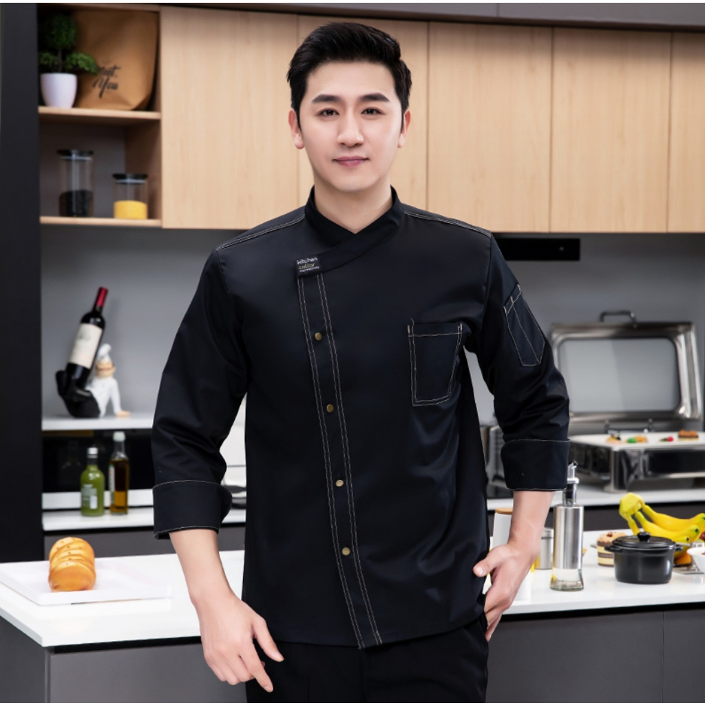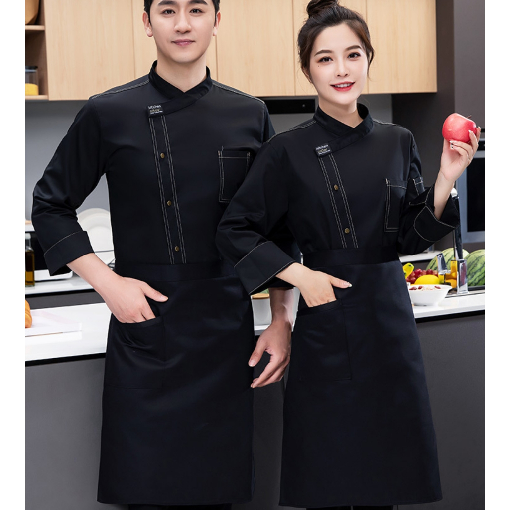 ชุดยูนิฟอร์มเชฟ แขนยาว ลายโลโก้เชฟ สีดํา สําหรับผู้ชาย และผู้หญิง เหมาะกับร้านอาหาร ร้านกาแฟ