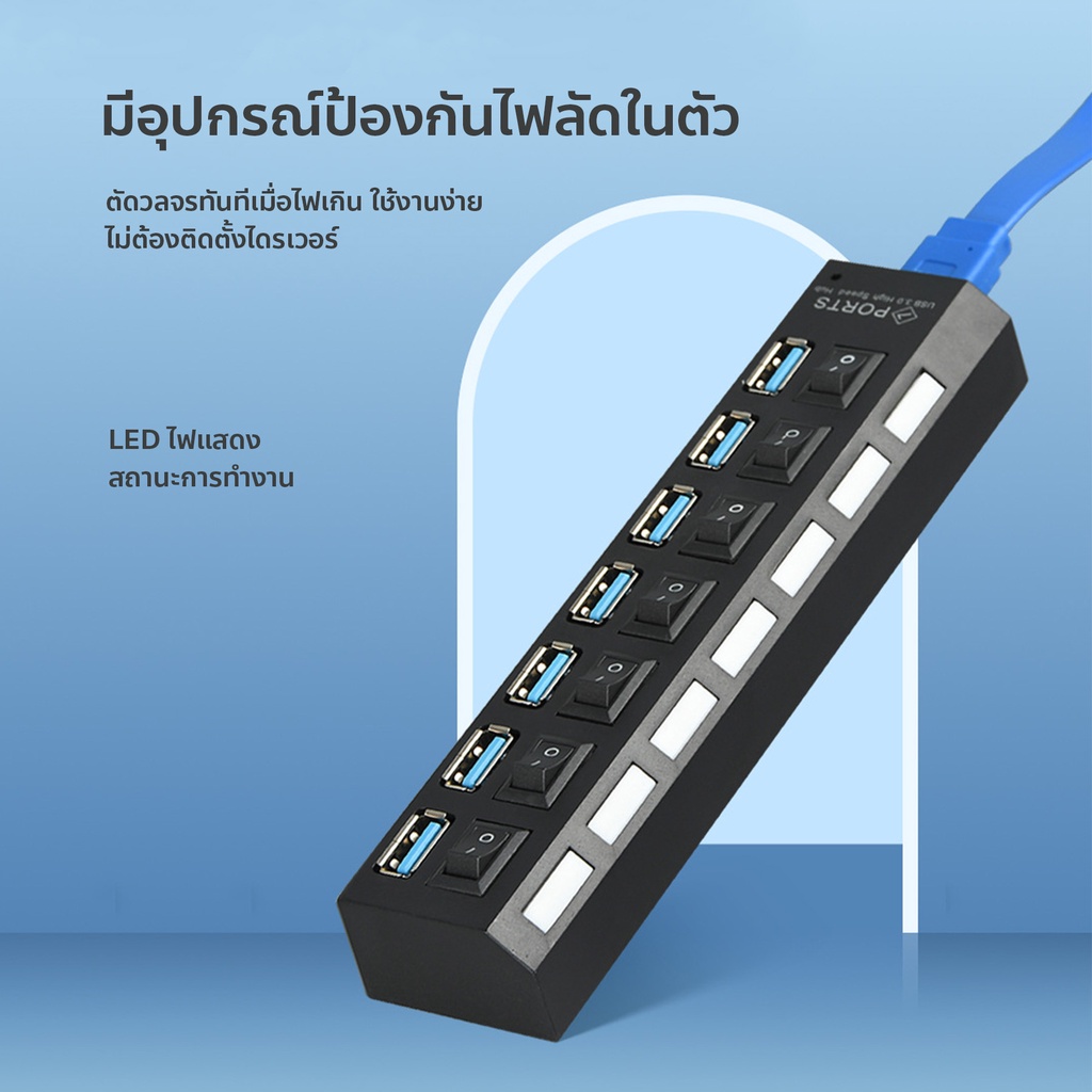 USB 3.0 Multi HUB Splitter ฮับ 7 พอร์ตการขยายความเร็วสูงอุปกรณ์ชาร์จคอมพิวเตอร์การถ่ายโอนข้อมูลด้วยสวิตช์สีน้ำเงินและลาก