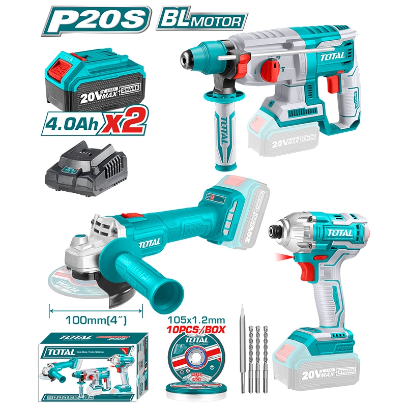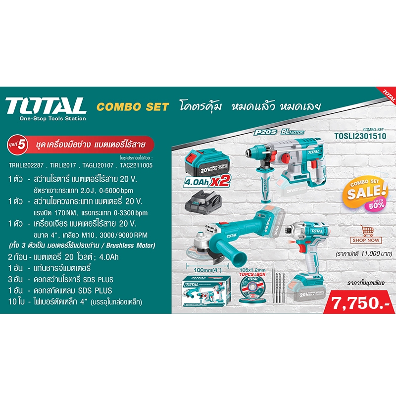 สว่านโรตารี่ไร้สาย + ไขควงกระแทกไร้สาย + เครื่องเจียรไร้สาย บัสเลสมอเตอร์ 3ตัวชุด TOTAL Combo set5 รุ่น TOSLI2301510