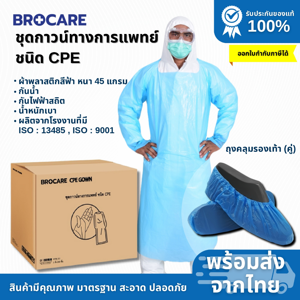 ชุดกาวน์ CPE ทางการแพทย์ชนิดใช้แล้วทิ้ง ยี่ห้อ Brocare ราคาถูกพร้อมส่ง