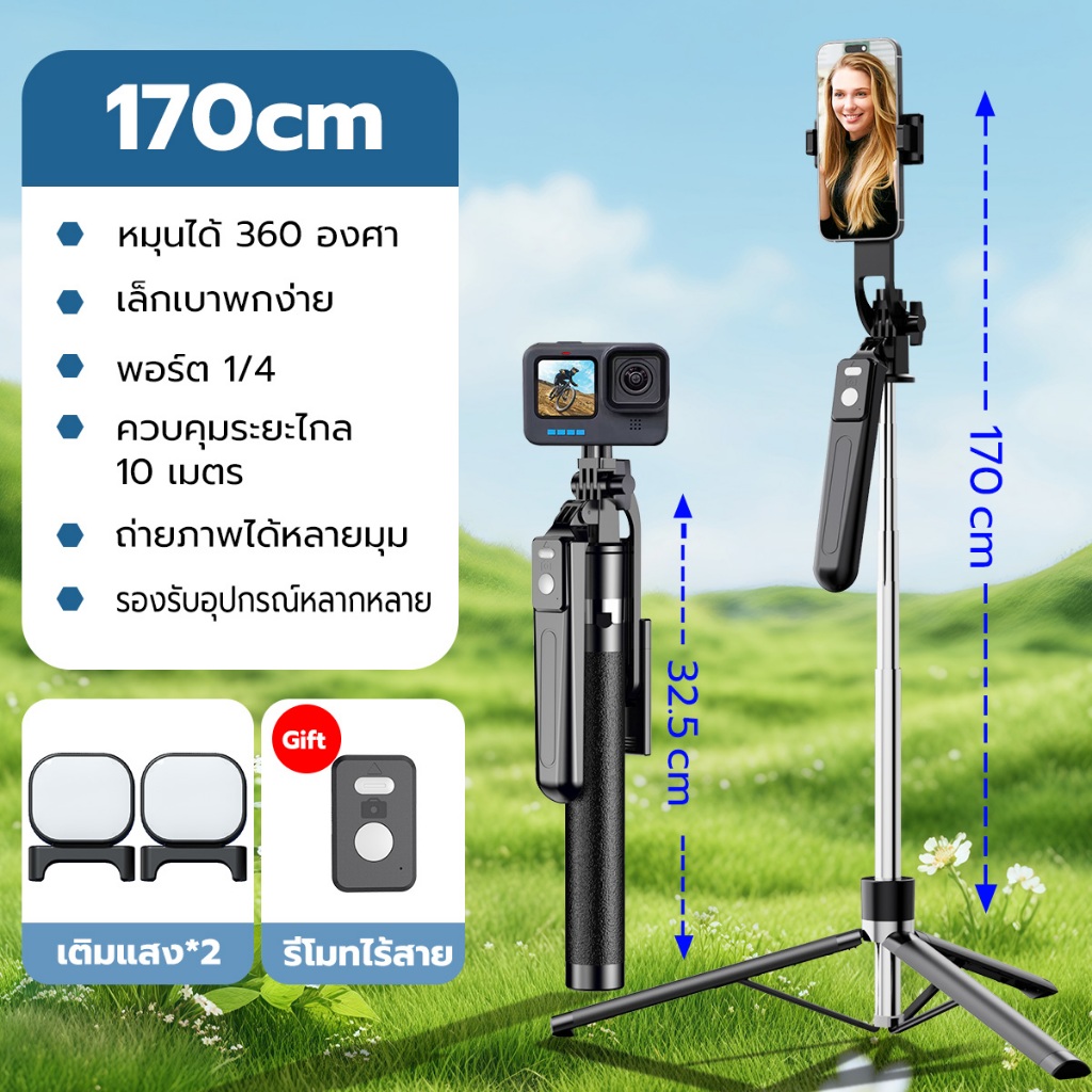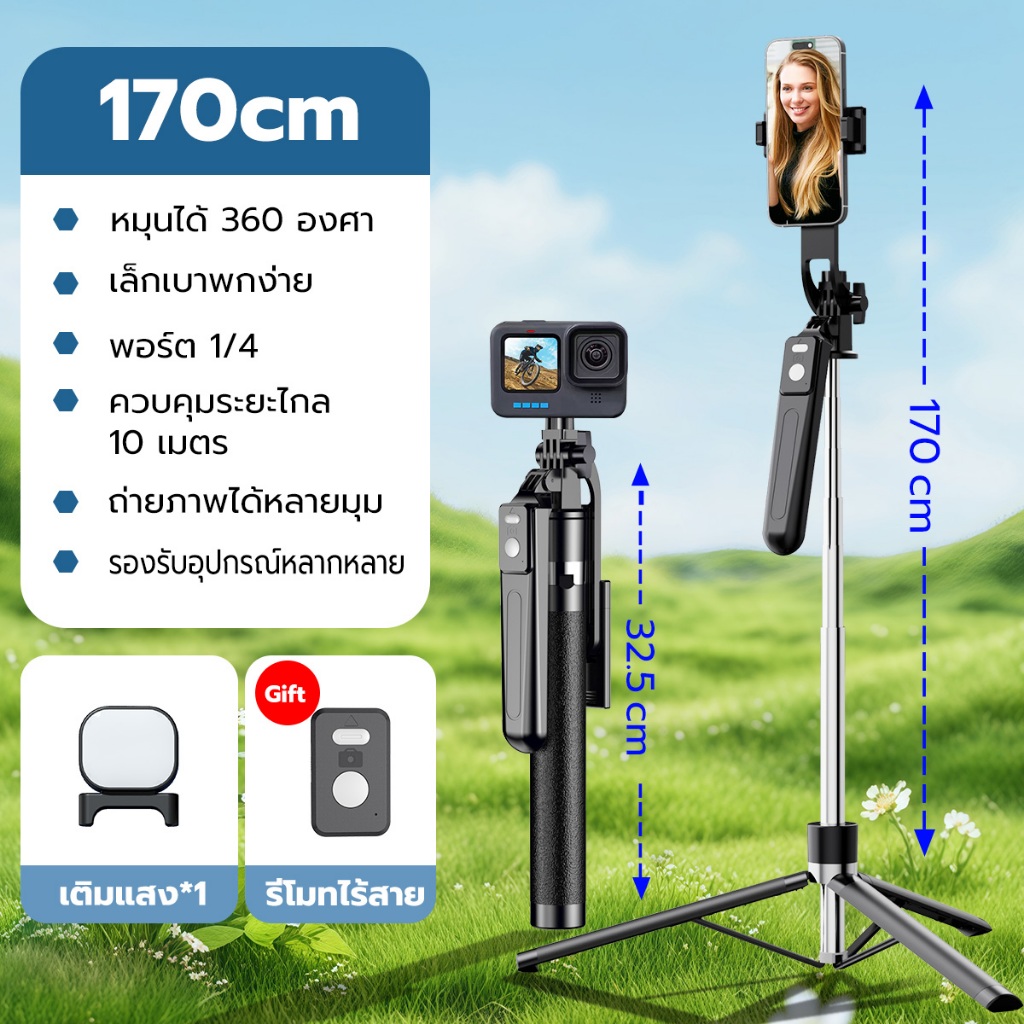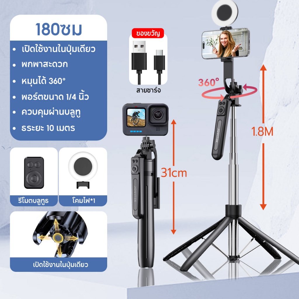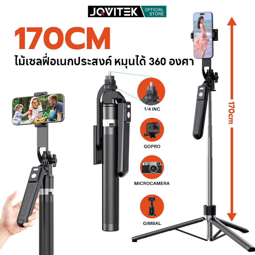 JQVITEK ขาตั้งกล้องเซลฟี่แบบขาตั้งกล้องอเนกประสงค์ 1.7เมตร หมุนได้ 360° พร้อมรีโมทบลูทูธ LED กล้องภายนอกแบบ Gimbal TR13S
