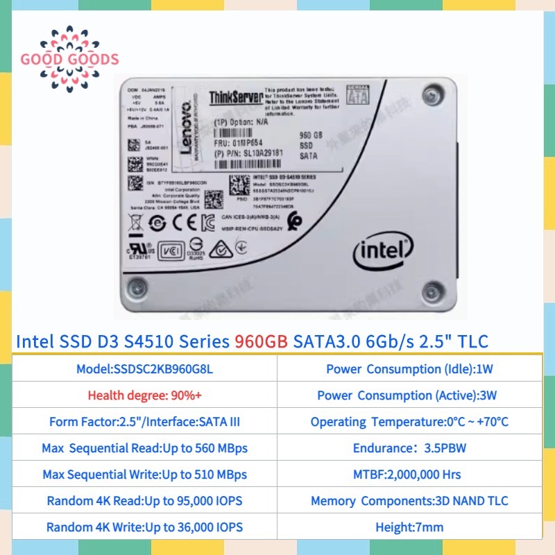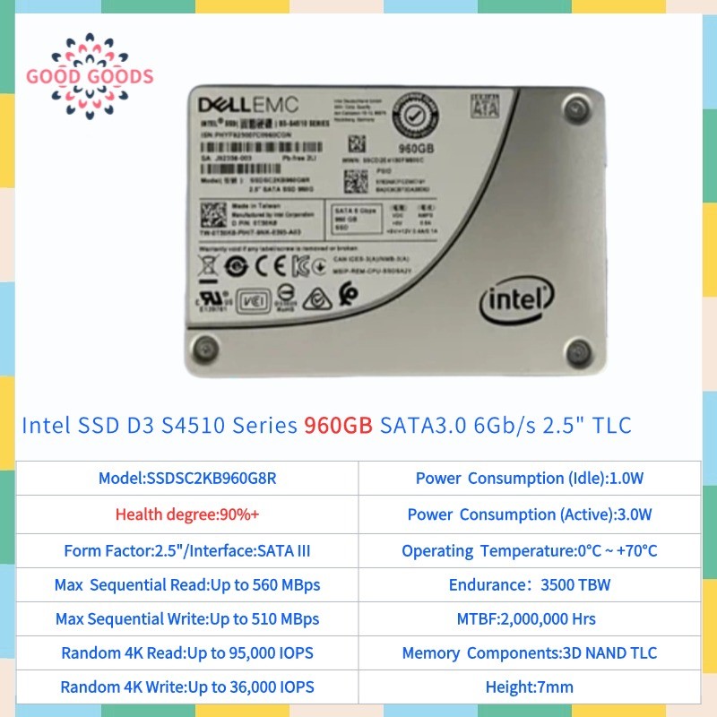 Intel D3 S4510 960GB 1.92TB 2.5 "Sata 6Gb/s ไดรฟ์ Solid State ภายใน 3D NAND TLC SSDSC2KB960G7