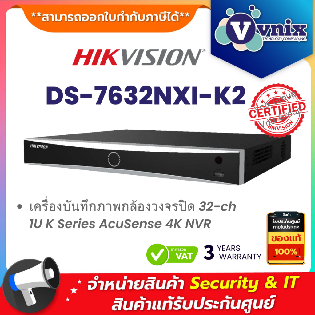 DS-7632NXI-K2 Hikvision เครื่องบันทึกภาพกล้องวงจรปิด 32-ch 1U K Series AcuSense 4K NVR By Vnix Group