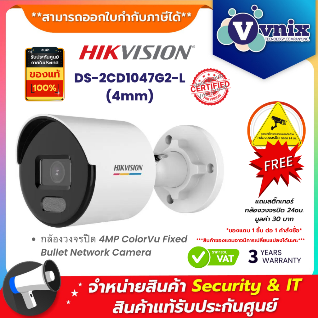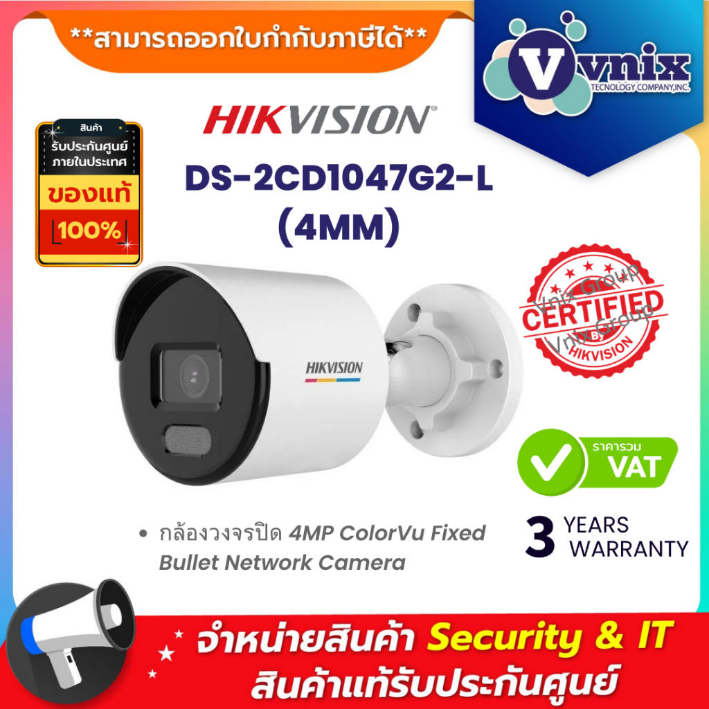 Hikvision DS-2CD1047G2-L(4mm) กล้องวงจรปิด 4MP ColorVu Fixed Bullet Network Camera By Vnix Group