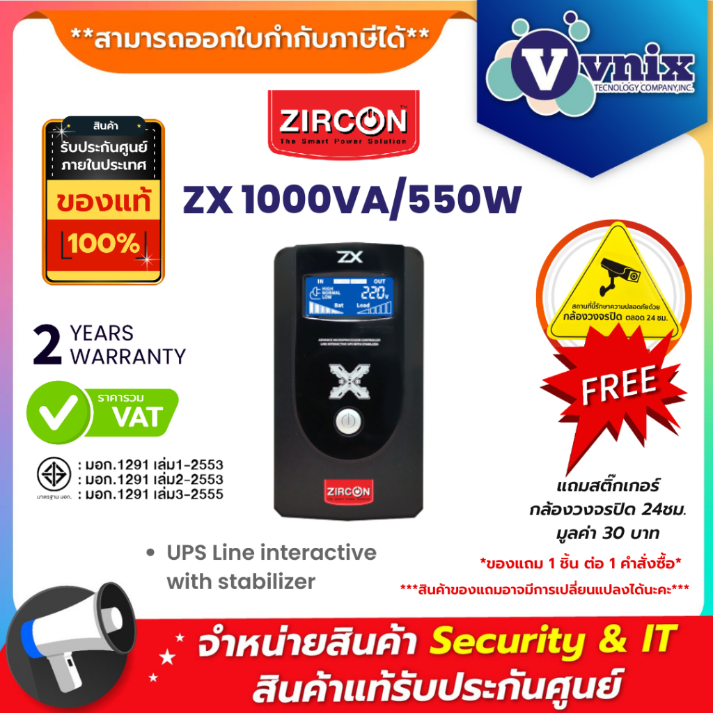 ZIRCON ZX 1000VA/550W เครื่องสำรองไฟ ชนิด Line interactive with stabilizer ประกัน 2 ปี By Vnix Group