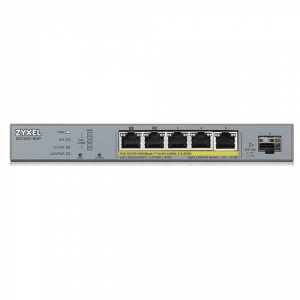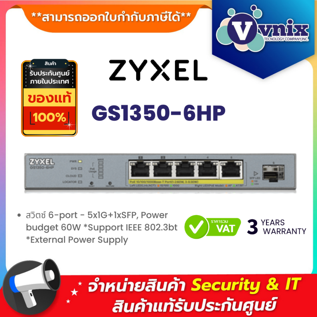 GS1350-6HP Zyxel สวิตซ์ 6-port - 5x1G+1xSFP, Power budget 60W *Support IEEE 802.3bt *External Power Supply By Vnix Grou
