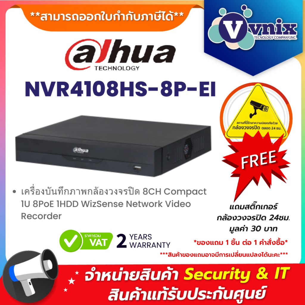 Dahua NVR4108HS-8P-EI เครื่องบันทึกภาพกล้องวงจรปิด 8CHCompact 1U 8PoE 1HDD WizSense Network Video Recorder By Vnix Group