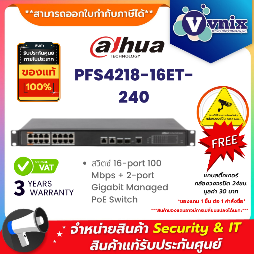 DAHUA PFS4218-16ET-240 สวิตซ์ 16-port 100 Mbps + 2-port Gigabit Managed PoE Switch 240W ประกัน 3 ปี by Vnix Group