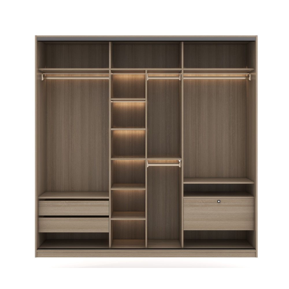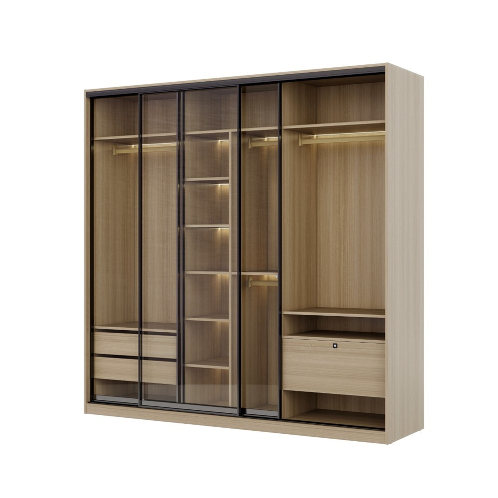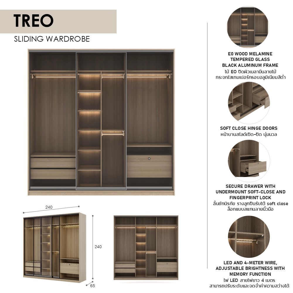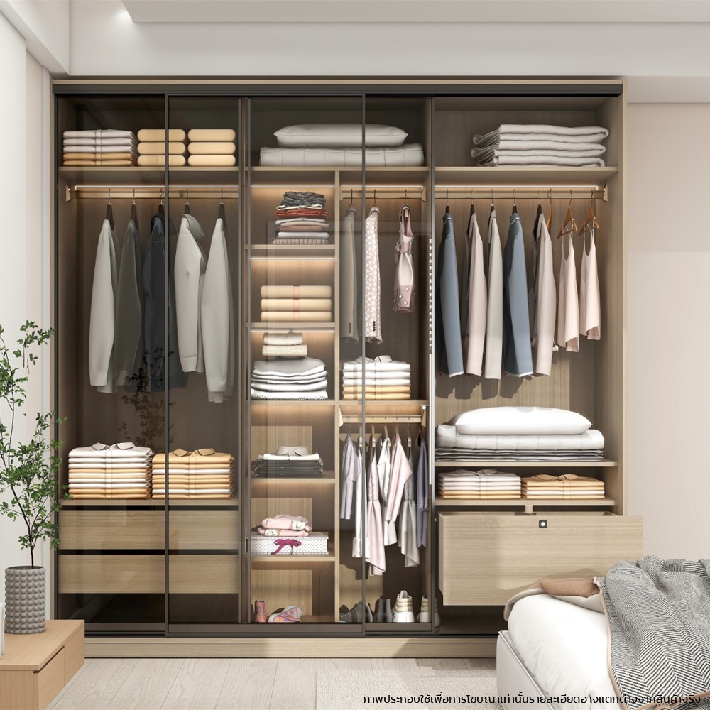 INDEX LIVING MALL ตู้เสื้อผ้าบานสไลด์กระจกใส รุ่นทรีโอ้ ขนาด 240 ซม. - สีไลท์ วู้ด/ใสโปร่ง