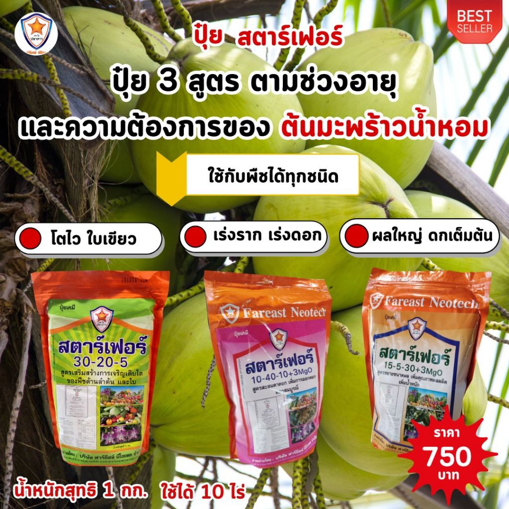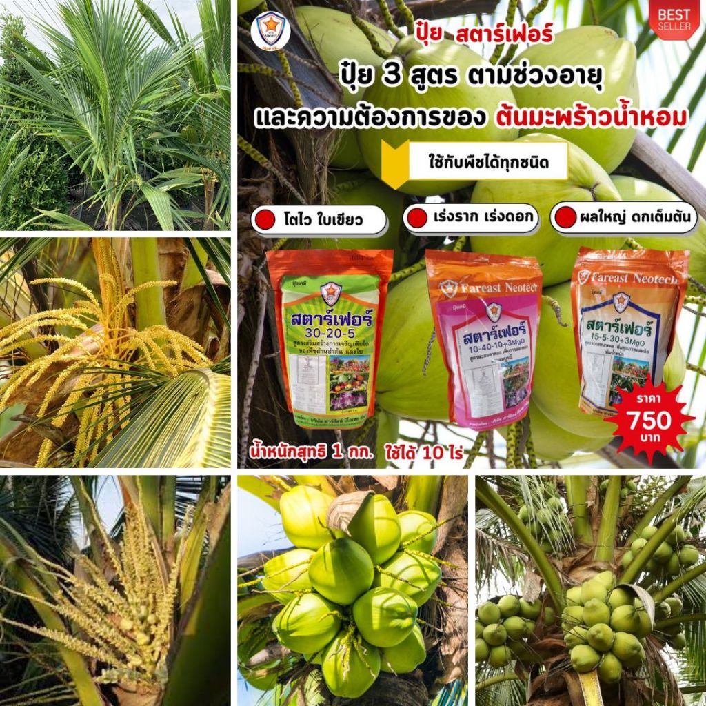 ปุ๋ย สตาร์เฟอร์ 3 สูตร พิชิตทุกความต้องการของมะพร้าวน้ำหอม โตไว ออกดอก ดก ผลใหญ่ น้ำหนักดี แข็งแรง เพิ่มผลผลิต