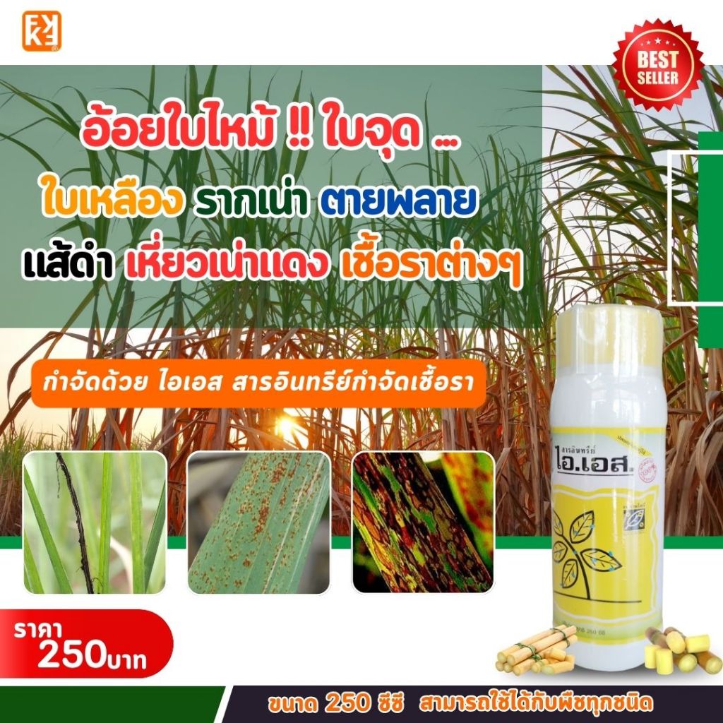 อ้อยใบไหม้ ใบจุด ใบเหลือง รากเน่า แส้ดำ ตายพลาย เหี่ยวเน่าแดง โรคราต่างๆ ป้องกันกำจัดด้วย ไอเอส และเร่งฟื้นฟู ด้วย FK-T