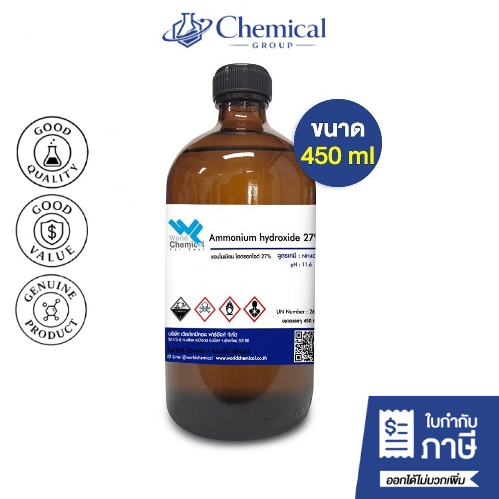 แอมโมเนียม ไฮดรอกไซด์ (Ammonium hydroxide 27%) ขนาด 450 ml. สำหรับทำเครื่องประดับ ฟอกสี อุสาหกรรมยาง - world chemical