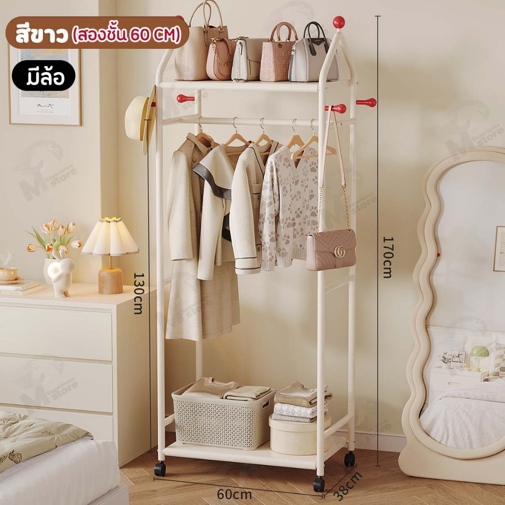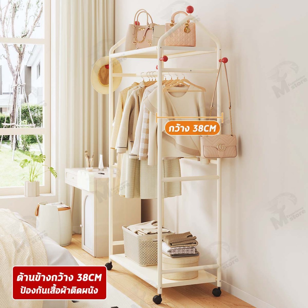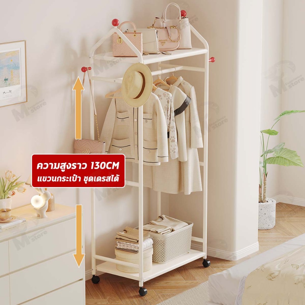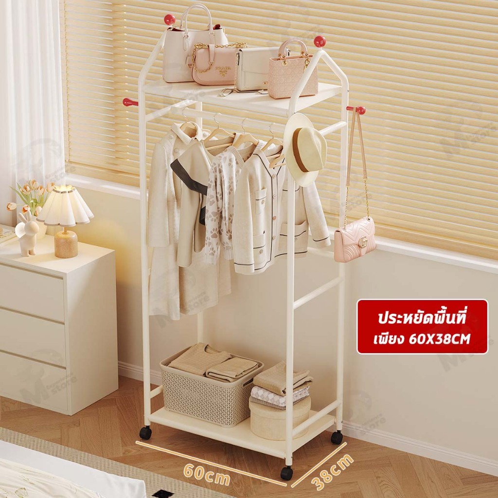 [ ราวทรงบ้าน 3in1 ] ราวแขวนผ้า ราวตากผ้า ชั้นวางของ ตะขอแขวนหมวก กระเป๋า สไตล์มินิมอล แบบมีล้อ/ไม่มีล้อ โครงเหล็ก AK