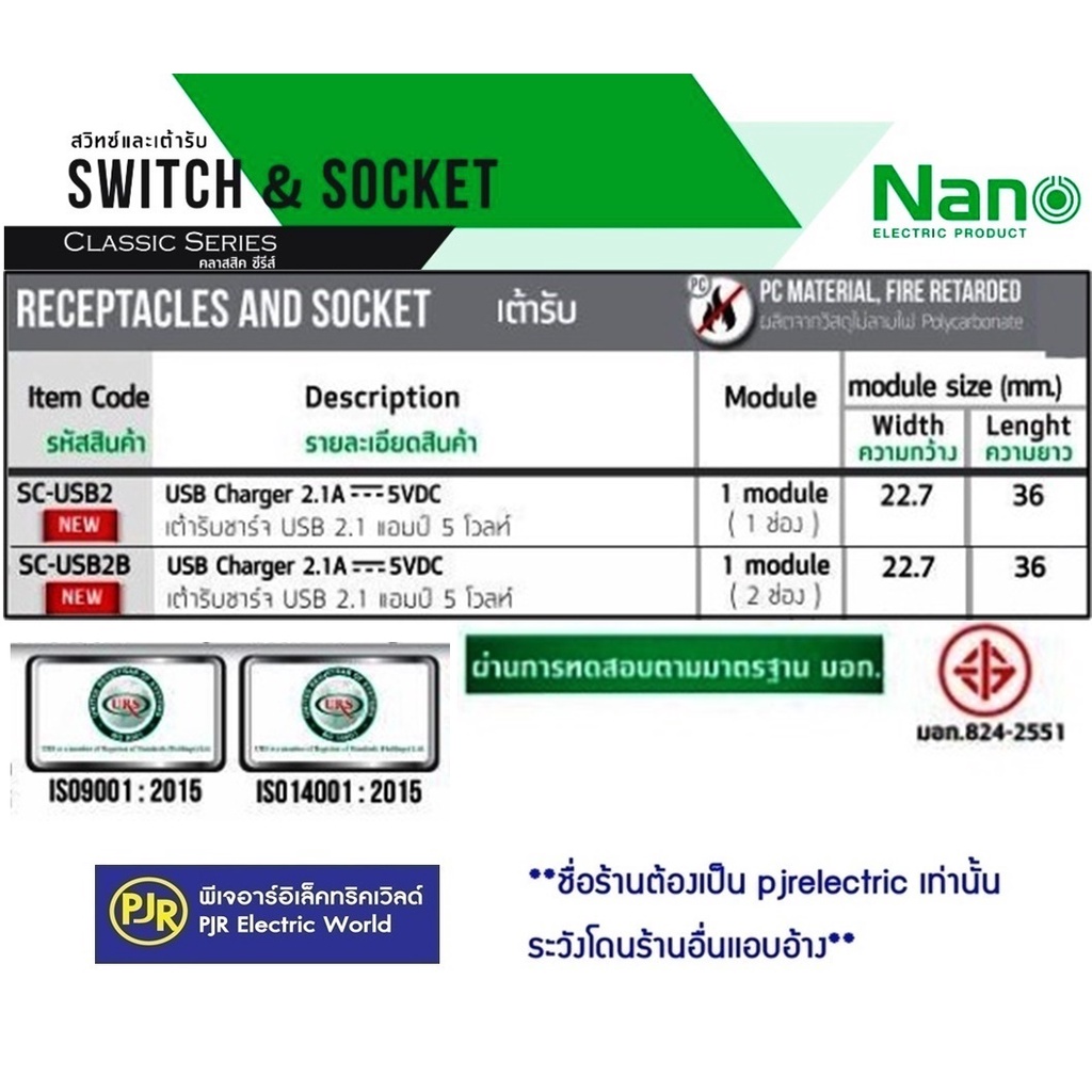 PJR **มีขายส่ง❗❗❗** ปลั๊ก เต้ารับ USB NANO เต้ารับชาร์จ 5V 2.1A 2 รู ขนาด 1 ช่อง สีขาว , สีดำ SC-USB2, SC-USB2B