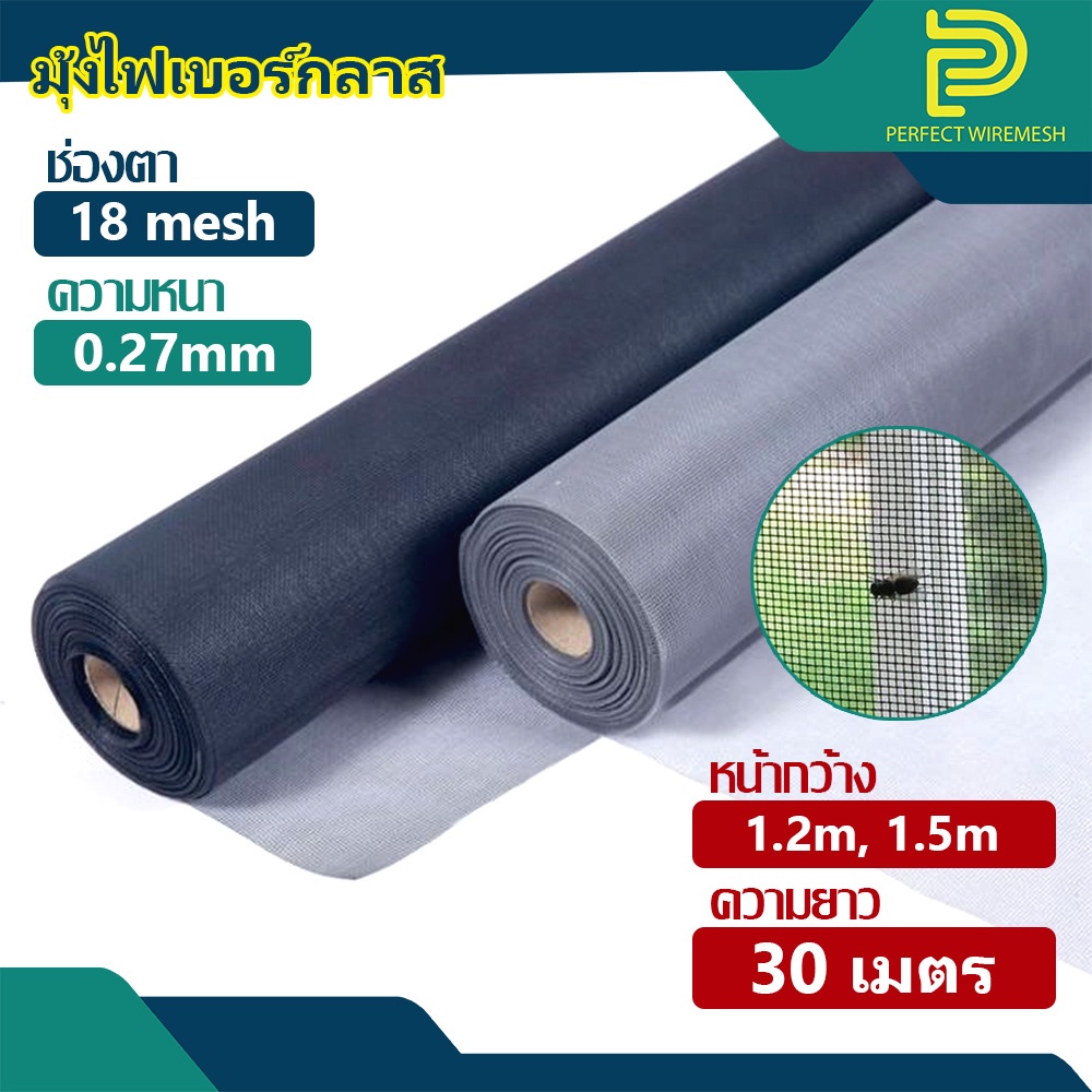 (กว้าง 1.2m,1.5m ยาว 30m) มุ้งไฟเบอร์กลาส 18mesh/0.27mm สี เทา/ดำ/ขาว มุ้งลวดกันยุง กันแมลง ติดกับกรอบประตู หน้าต่าง