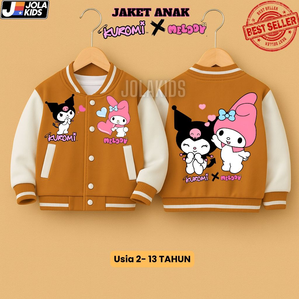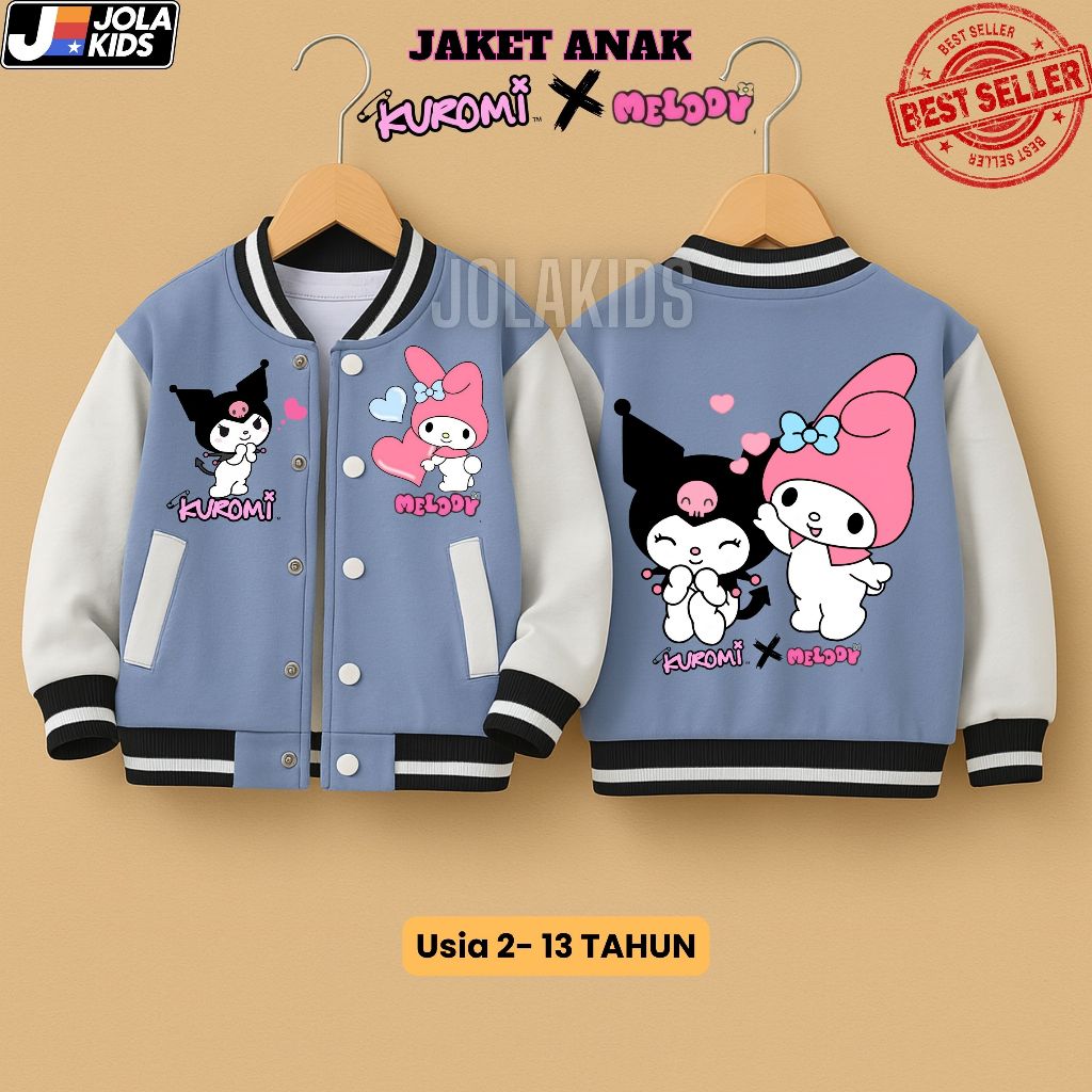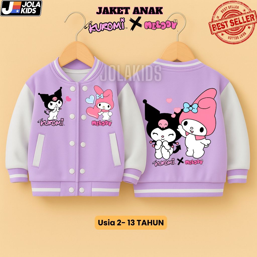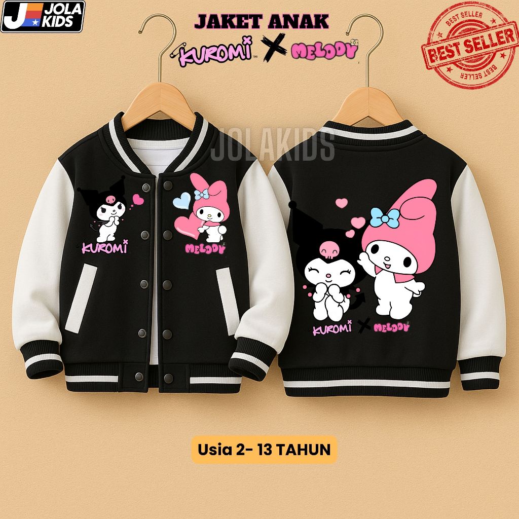 JOLAKIDS Kuromi x Melody เสื้อแจ็คเก็ตเบสบอลและซิปสําหรับเด็กหญิงและเด็กชายอายุ 2 - 12 ปี