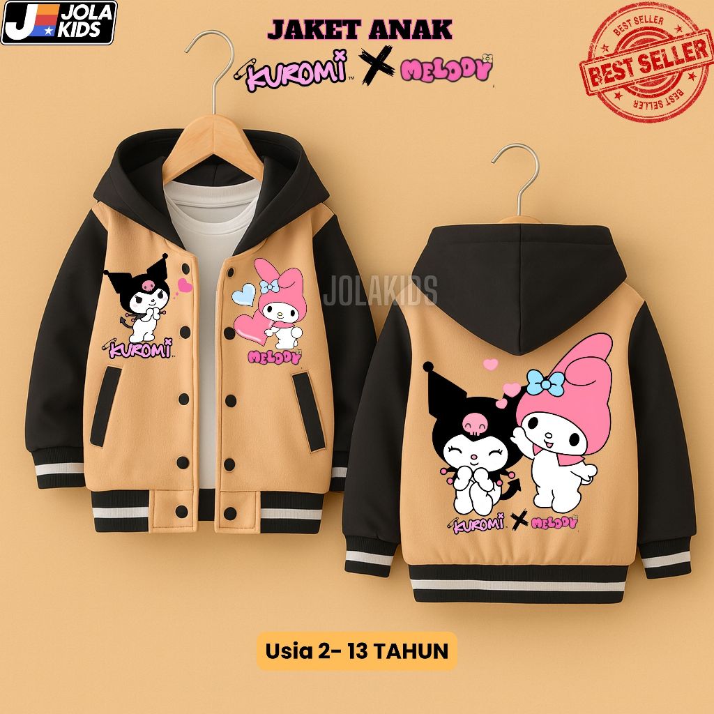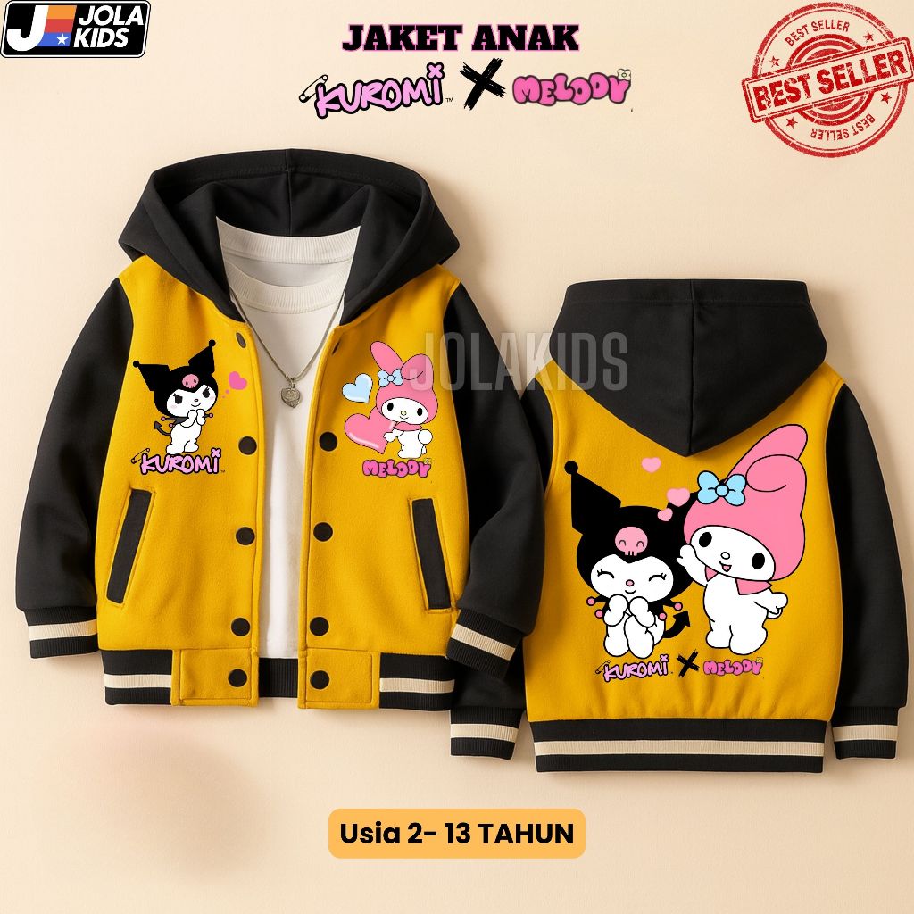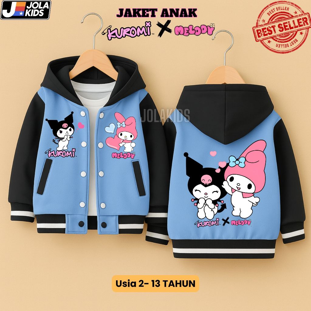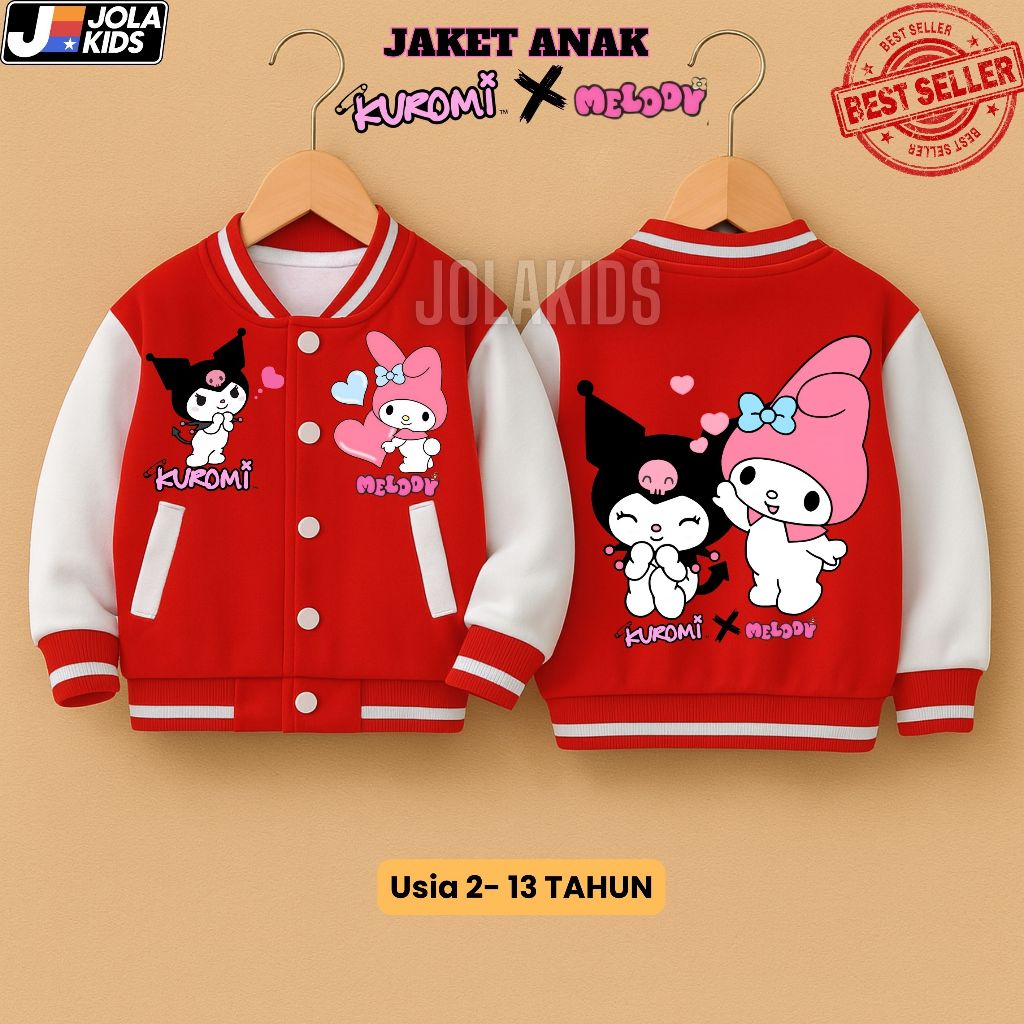 JOLAKIDS Kuromi x Melody เสื้อแจ็คเก็ตเบสบอลและซิปสําหรับเด็กหญิงและเด็กชายอายุ 2 - 12 ปี