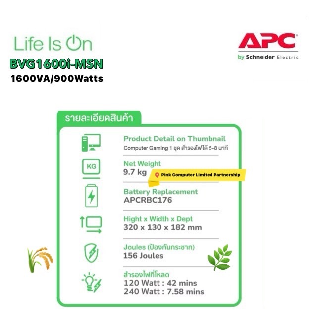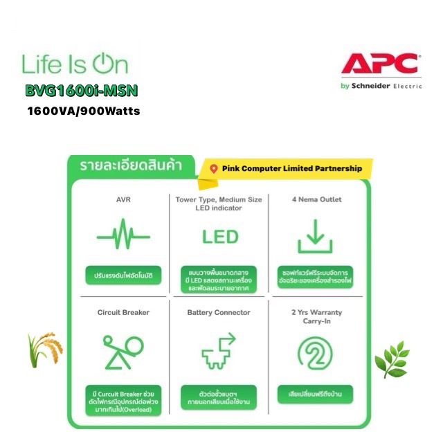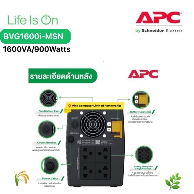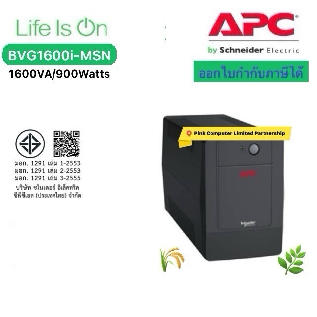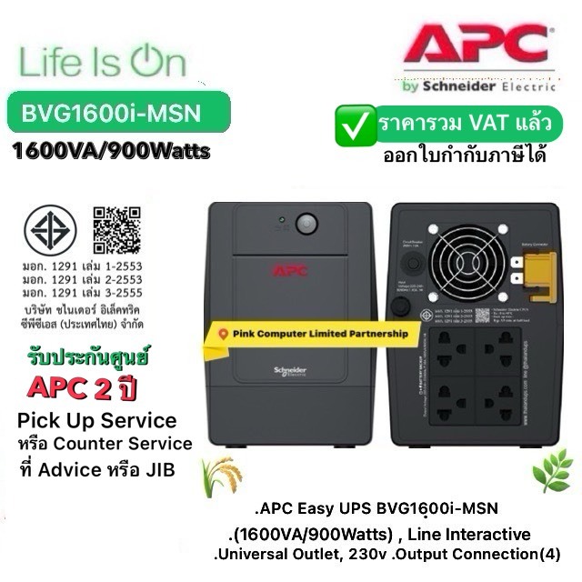 APC UPS BVG1600i-MSN(1600VA/900W)แถมกระเป๋าแขวนAPC ประกันศูนย์APC 2ปี Pick Up Service* มี มอก ราคารวม VATแล้วออก VATได้