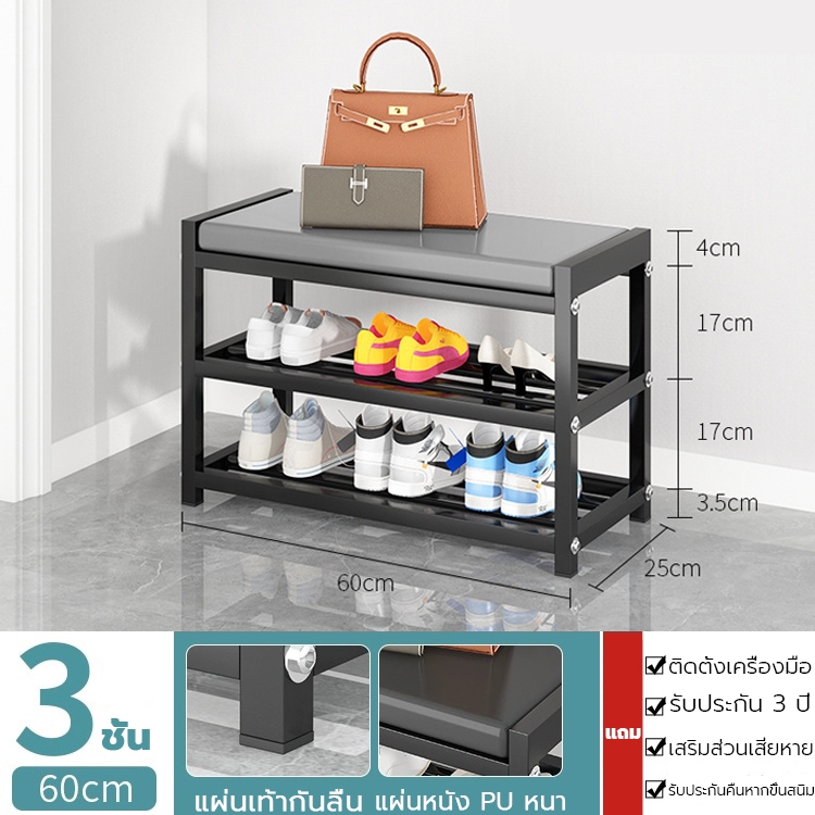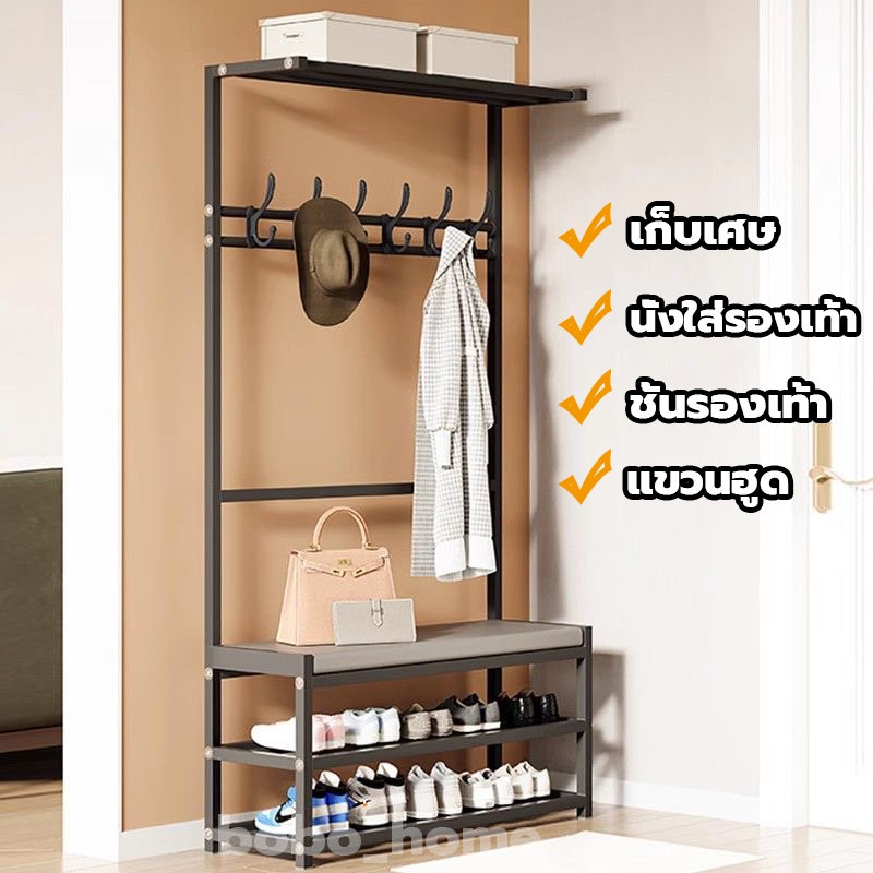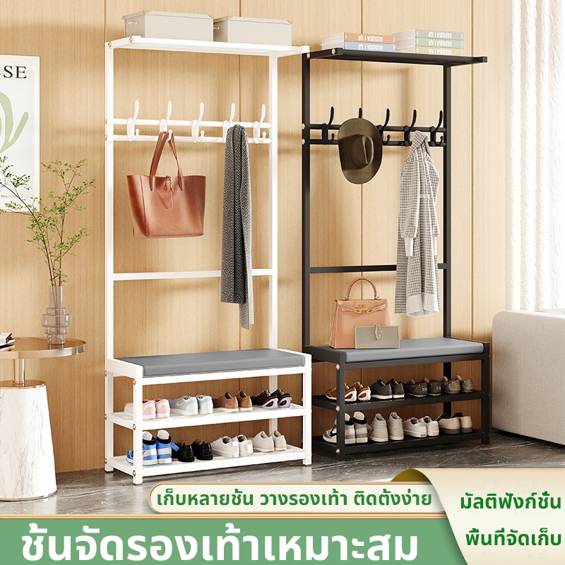 [3in1]ชั้นวางรองเท้า นั่งใส่รองเท้า ราวตากผ้า พร้อมตะขอแขวนเสื้อ+หมวก อเนกประสงค์ วัสดุเหล็กคาร์บอน แข็งแรงทนทาน