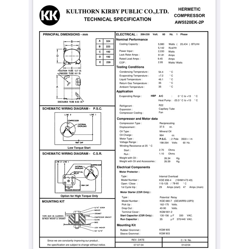 Kulthorn คอมเพรสเซอร์แอร์ ลูกสูบ กุลธร รุ่น AW5520EK ขนาด 17,700 BTU, น้ำยาR-22 ,1-3/4แรงม้า (HP),220V, ( AW5520 )