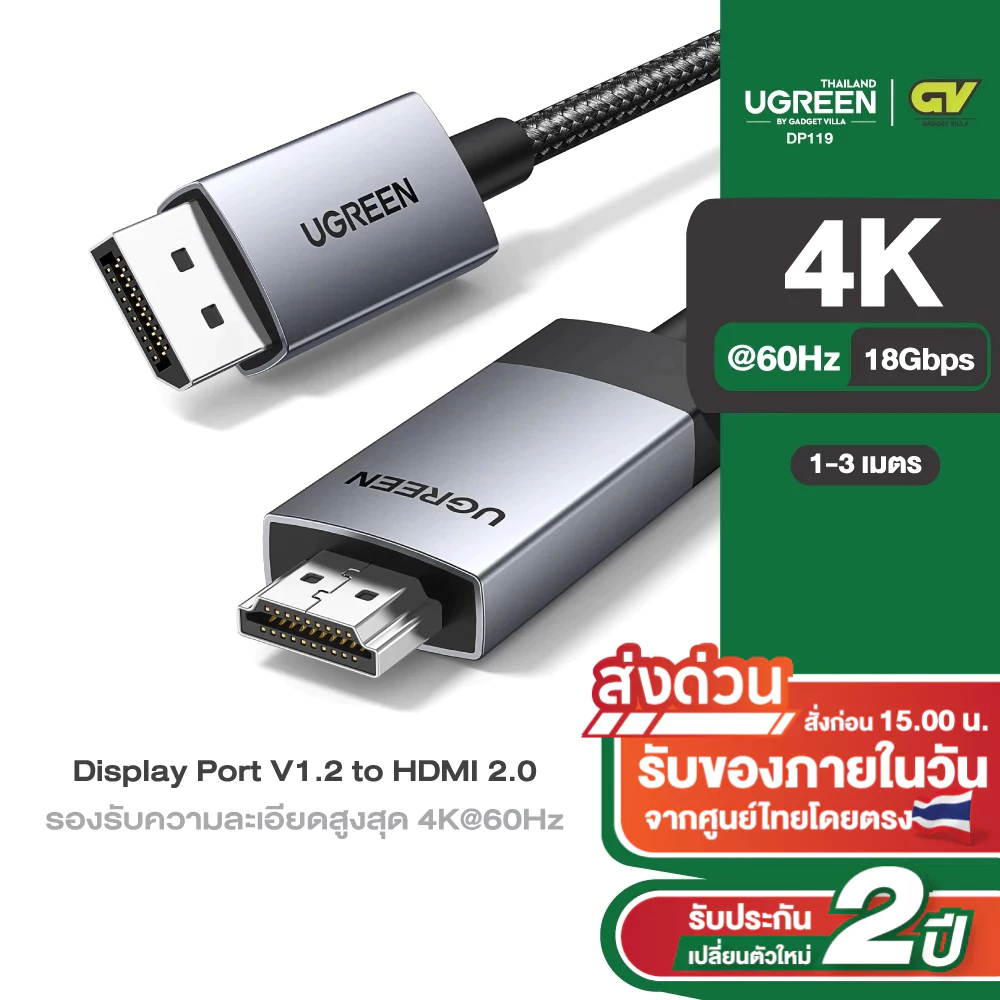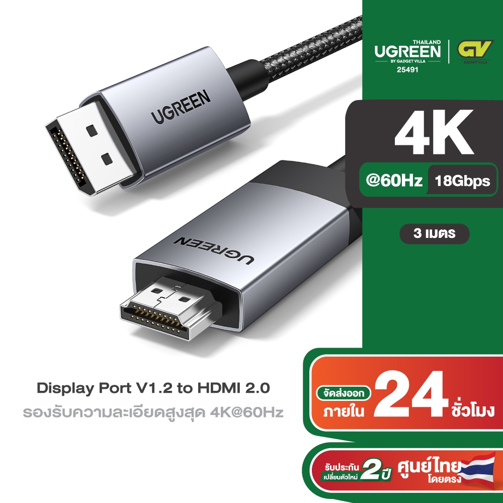 UGREEN รุ่น DP119 DisplayPort to HDMI Cable 4K 60Hz HDR Active DP 1.2 to HDMI 2.0 สายไฟถัก Aluminum ยาว1-3 เมตร