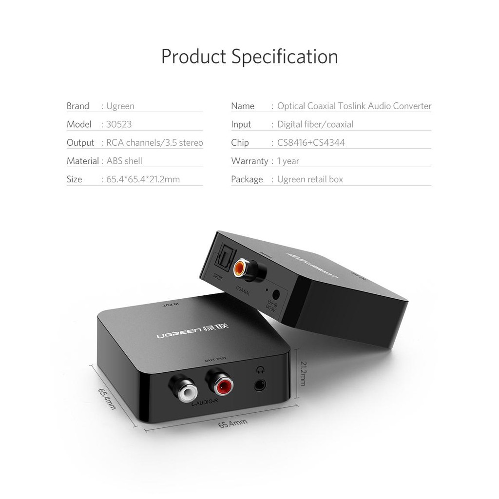 UGREEN รุ่น 30523 ตัวแปลงช่องต่อ Optical DAC ส่งสัญญาณ Digital (ดิจิทัล) Coaxial เ ป็น Analog (อนาล็อก) 2RCA RCA L/R และ