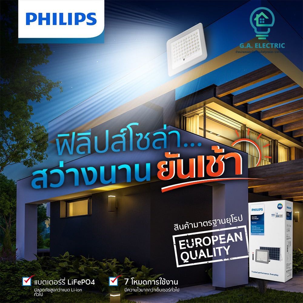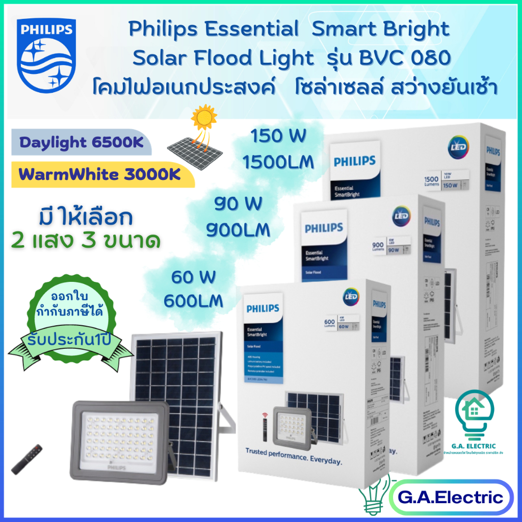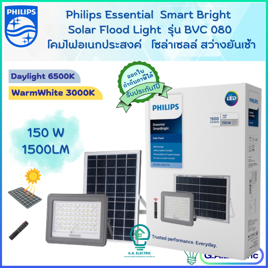 Philips โคมไฟฟลัดไลท์ ฟิลิปส์โซล่าเซลล์ Essential SmartBright Solar Flood Light รุ่น BVC080 Philips สายความยาว5เมตร