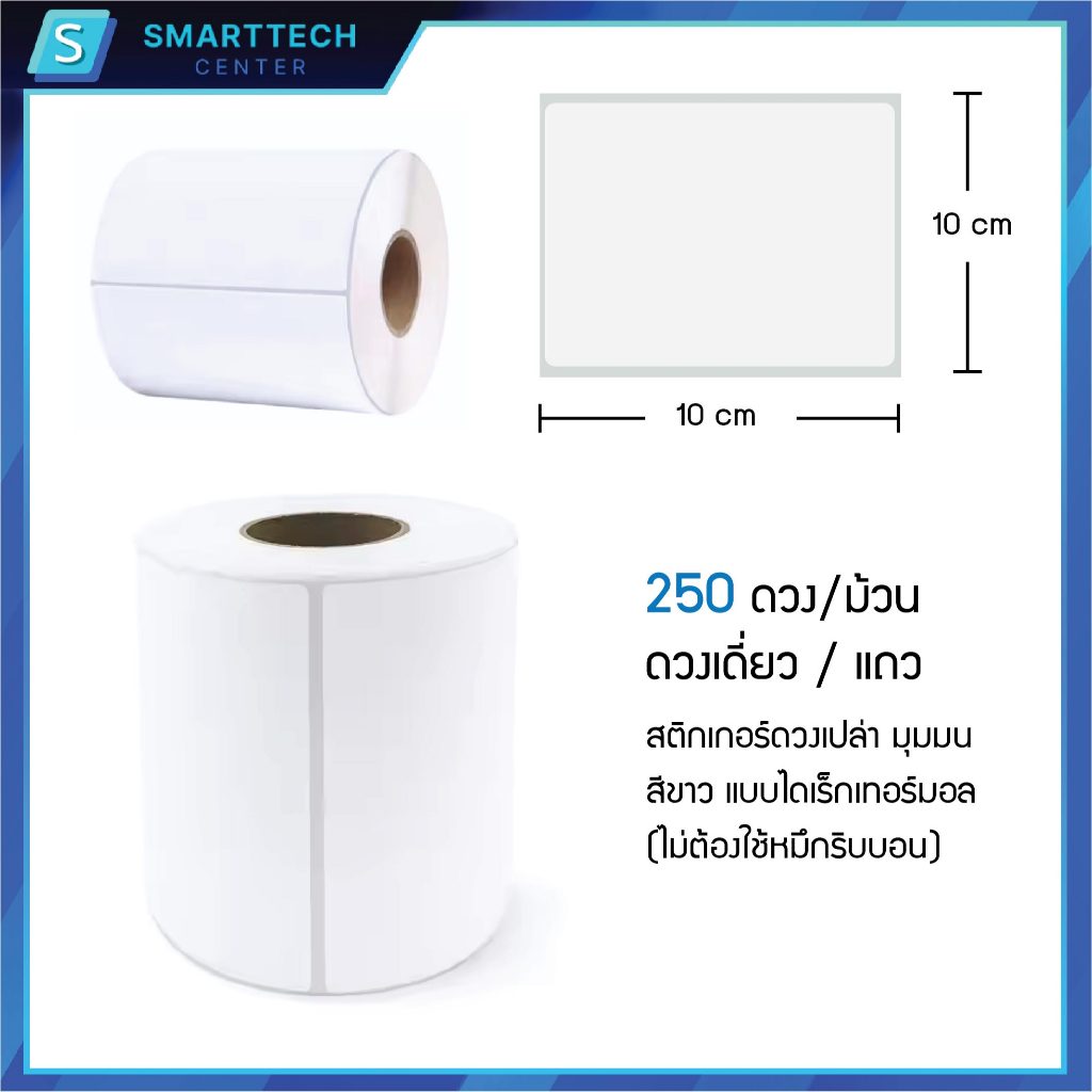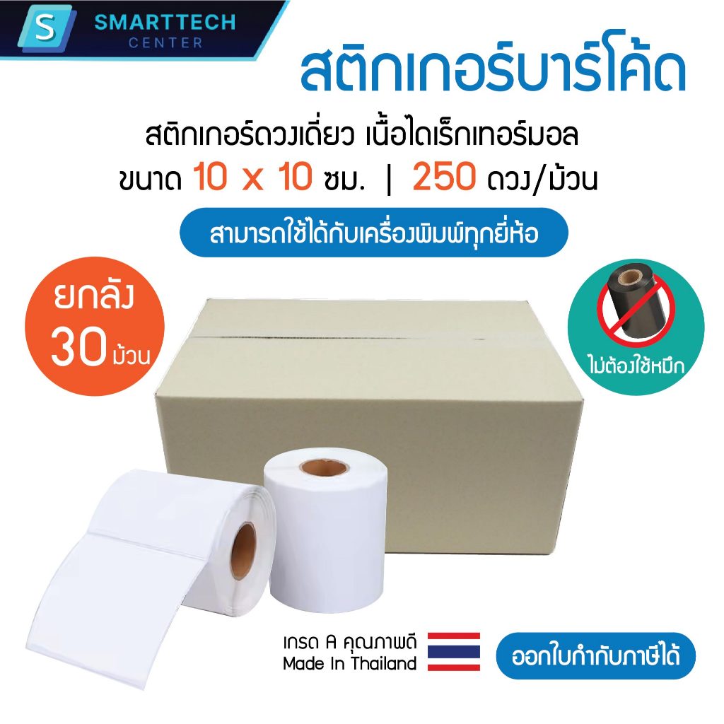 Sticker Direct Thermal 10x10 cm สติกเกอร์ความร้อน ไดเร็กเทอร์มอล 250 ดวง/ม้วน ไม่ต้องใช้หมึก [ยกลัง 30 ม้วน]